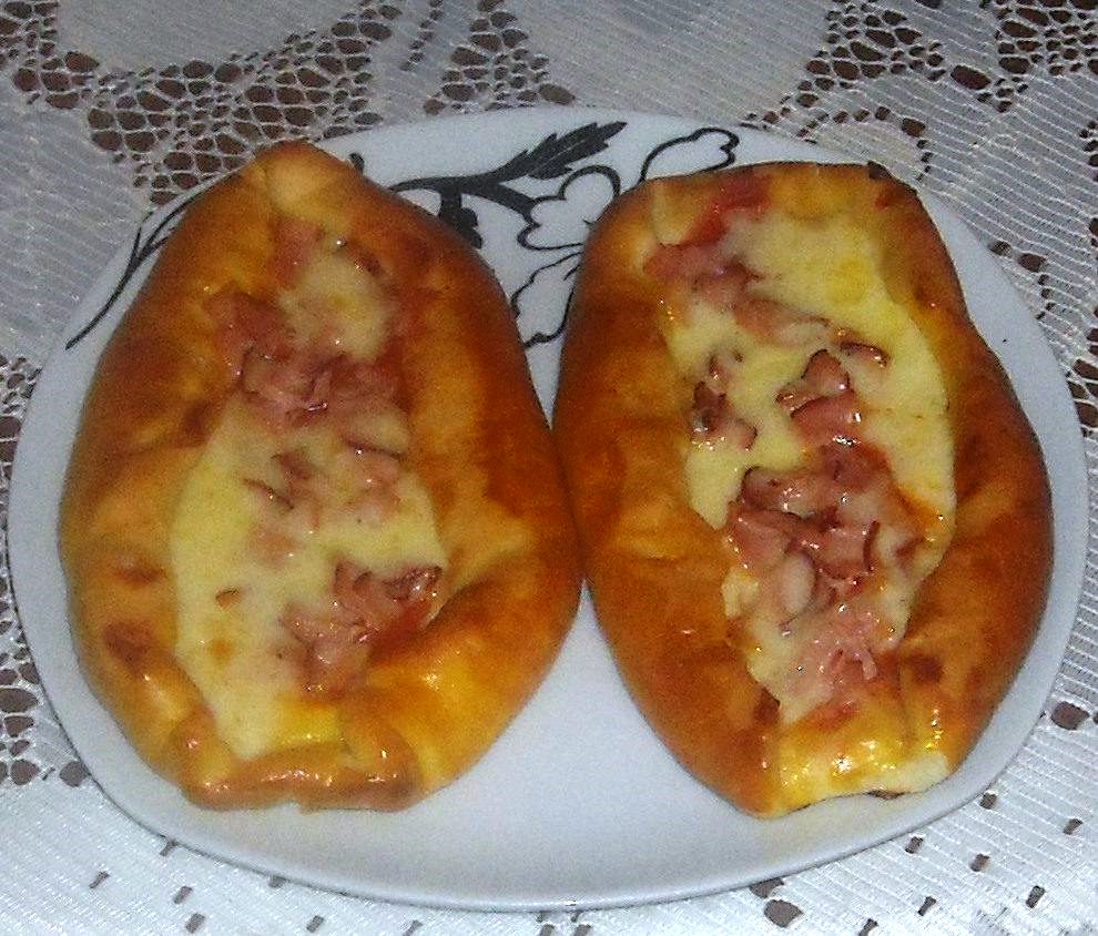 Τοποθετήστε σε ένα ταψί στρωμένο με χαρτί ψησίματος και στο λεπτότερο μέρος τοποθετήστε κύβους μπέικον και τυρί από πάνω. Επαναλάβετε το ίδιο με άλλη ζύμη και σχηματίστε άλλη πάσταλμα. Καλύψτε τα άκρα με μαργαρίνη ή βούτυρο και κρόκο αυγού, απλώστε σουσάμι πάνω από τις άκρες και αφήστε τα να φουσκώσουν για μισή ώρα.