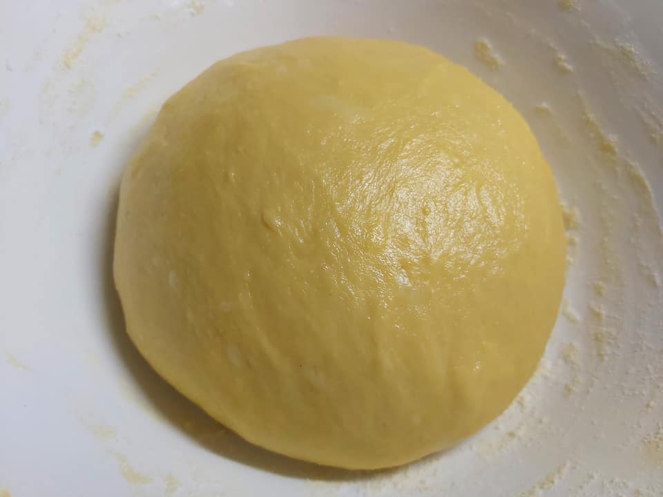 Ζυμώνουμε τη ζύμη. Εάν είναι στο χέρι: φτιάξτε ένα πηγάδι στο αλεύρι, ρίξτε τα υγρά συστατικά μέσα και αρχίστε να ανακατεύετε, βάζοντας περιοδικά τα δάχτυλά σας στο λιωμένο βούτυρο (και ούτω καθεξής έως ότου τελειώσει το βούτυρο) – θα πρέπει να πάρετε μια λεία ζύμη. Εάν βρίσκεται σε ζυμωτήριο – ρίξτε τα υγρά συστατικά στο κάτω μέρος του δοχείου, στη συνέχεια προσθέστε το αλεύρι και ξεκινήστε το πρόγραμμα “ζύμωσης”, ενώ το μηχάνημα ανακατεύει, προσθέστε σταδιακά το υπόλοιπο λιωμένο βούτυρο.