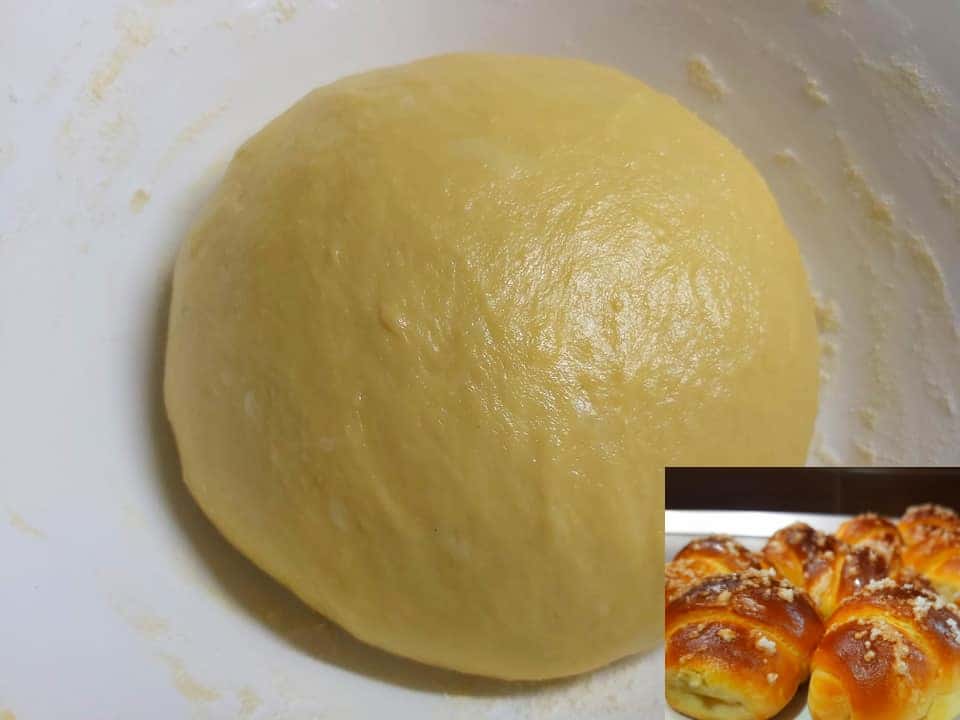 Ζυμώνουμε τη ζύμη. Εάν είναι στο χέρι: φτιάξτε ένα πηγάδι στο αλεύρι, ρίξτε τα υγρά συστατικά μέσα και αρχίστε να ανακατεύετε, βάζοντας περιοδικά τα δάχτυλά σας στο λιωμένο βούτυρο (και ούτω καθεξής έως ότου τελειώσει το βούτυρο) – θα πρέπει να πάρετε μια λεία ζύμη. Εάν βρίσκεται σε ζυμωτήριο – ρίξτε τα υγρά συστατικά στο κάτω μέρος του δοχείου, στη συνέχεια προσθέστε το αλεύρι και ξεκινήστε το πρόγραμμα “ζύμωσης”, ενώ το μηχάνημα ανακατεύει, προσθέστε σταδιακά το υπόλοιπο λιωμένο βούτυρο.