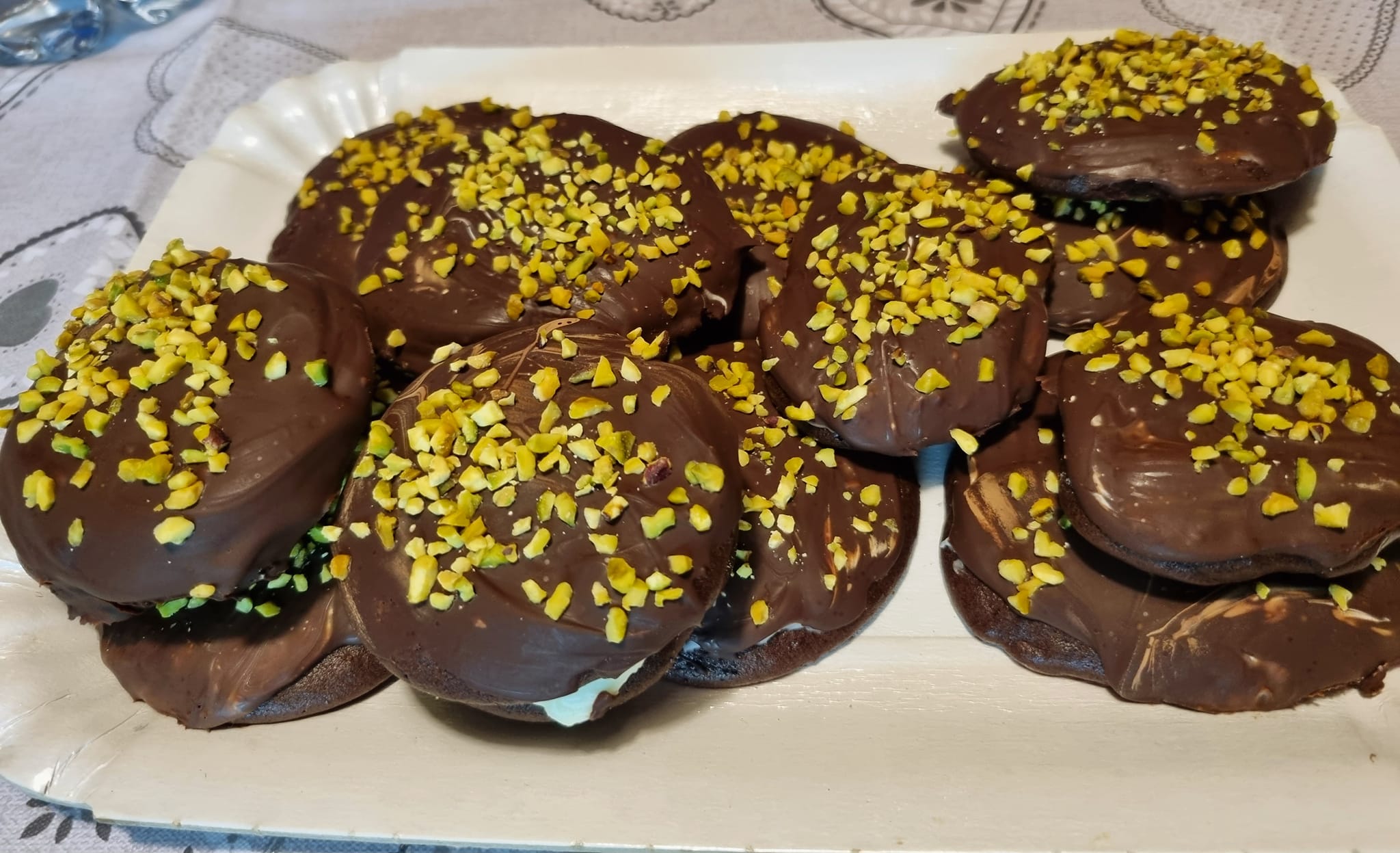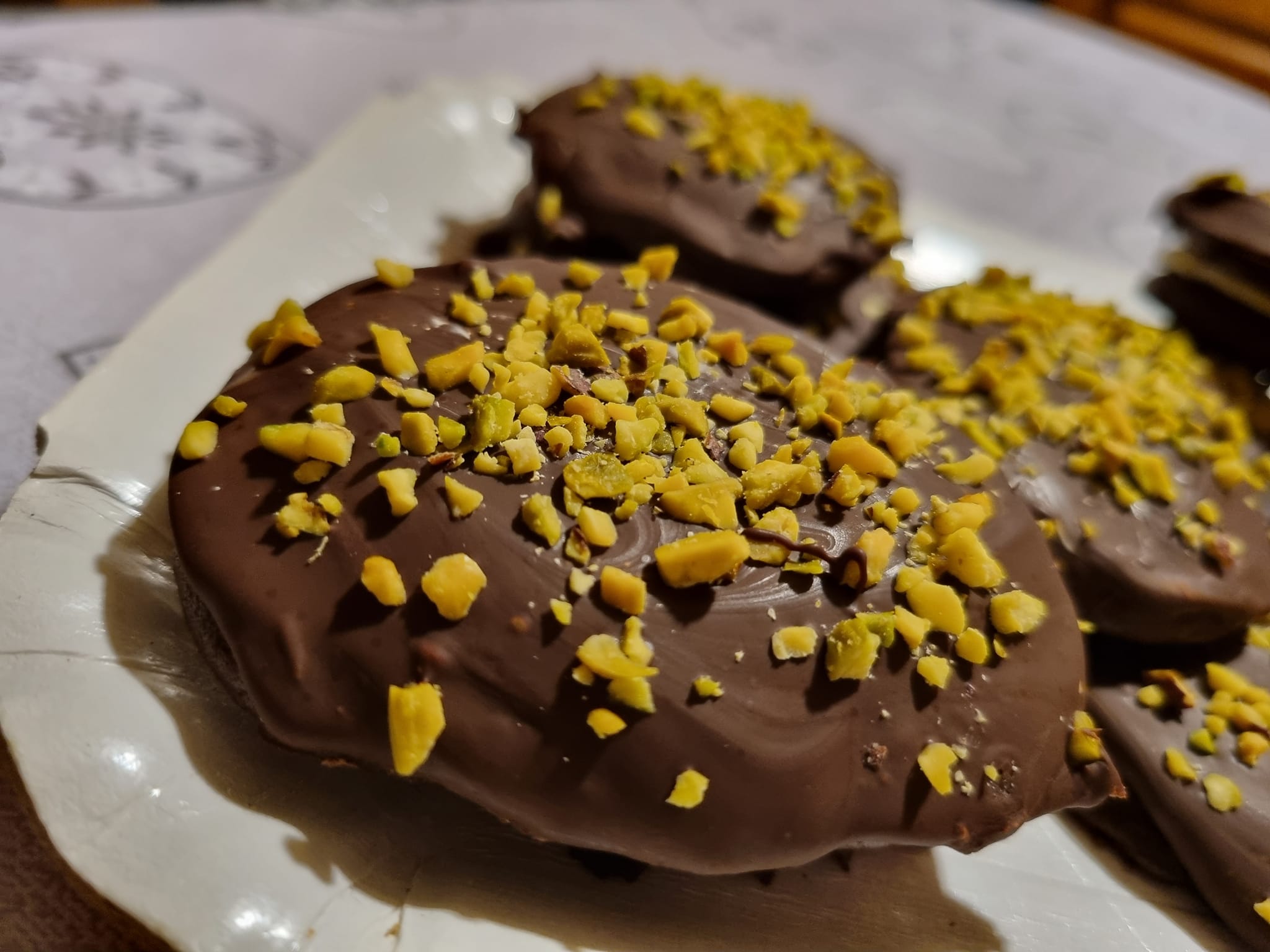 Μαλακά μπισκότα κακάο με γλάσο μαύρης σοκολάτας και κόκκους φιστικιού αιγίνης