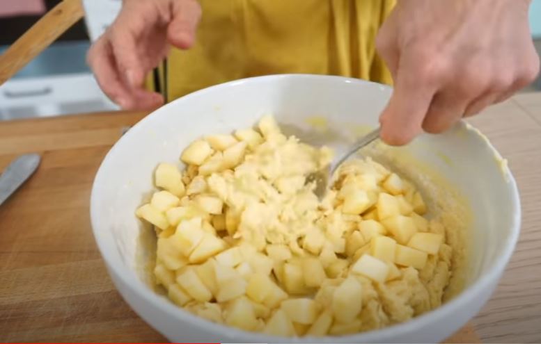 Σε ένα μπολ κόβουμε τα μήλα σε κομματάκια και στειβουμε μέσα ένα λεμόνι για να μην μαυρίσουν. Σε ένα μπολ σπάμε 2 αυγά και αφήνουμε στην άκρη.