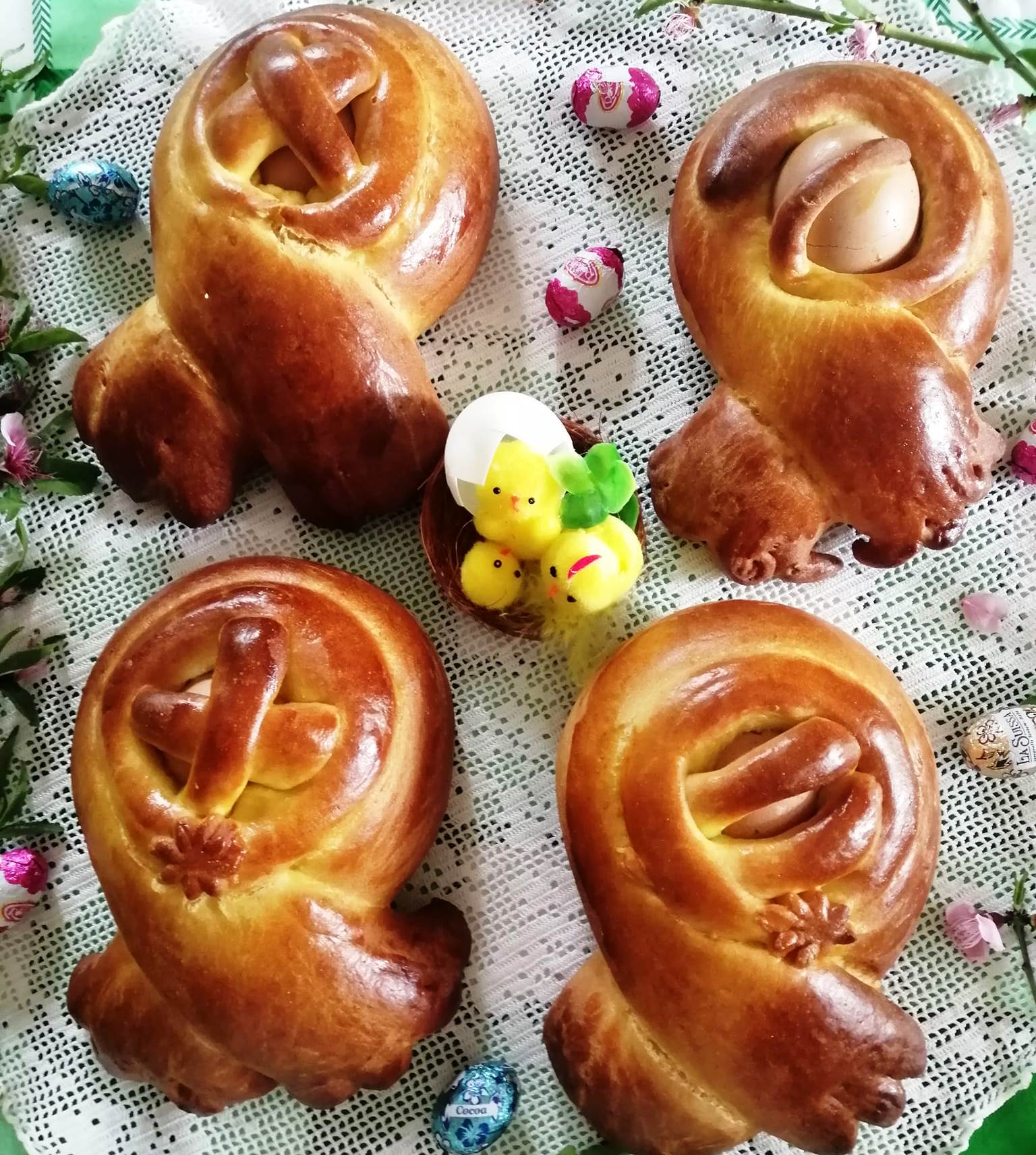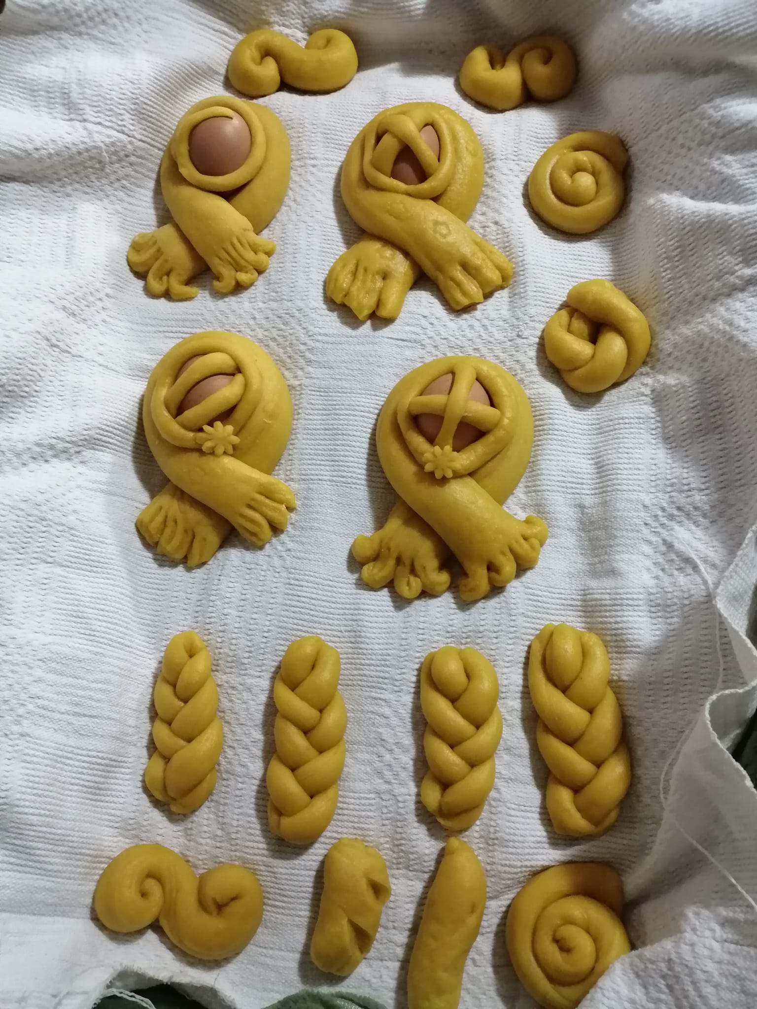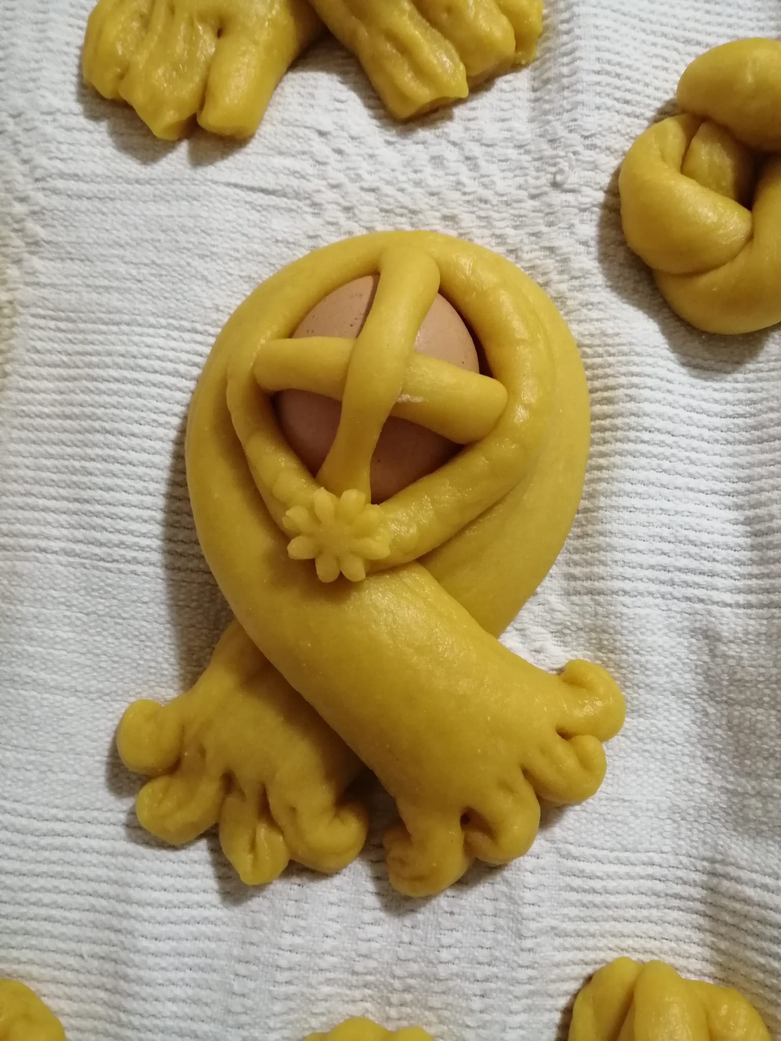 Την βάζουμε να φουσκώσει για μια-δυο ώρες ξαναπάρουμε τη ζύμη και κάνουμε τα σχεδια που βλέπτε στην φωτό Βάζουμε πάλι να φουσκώσουν.