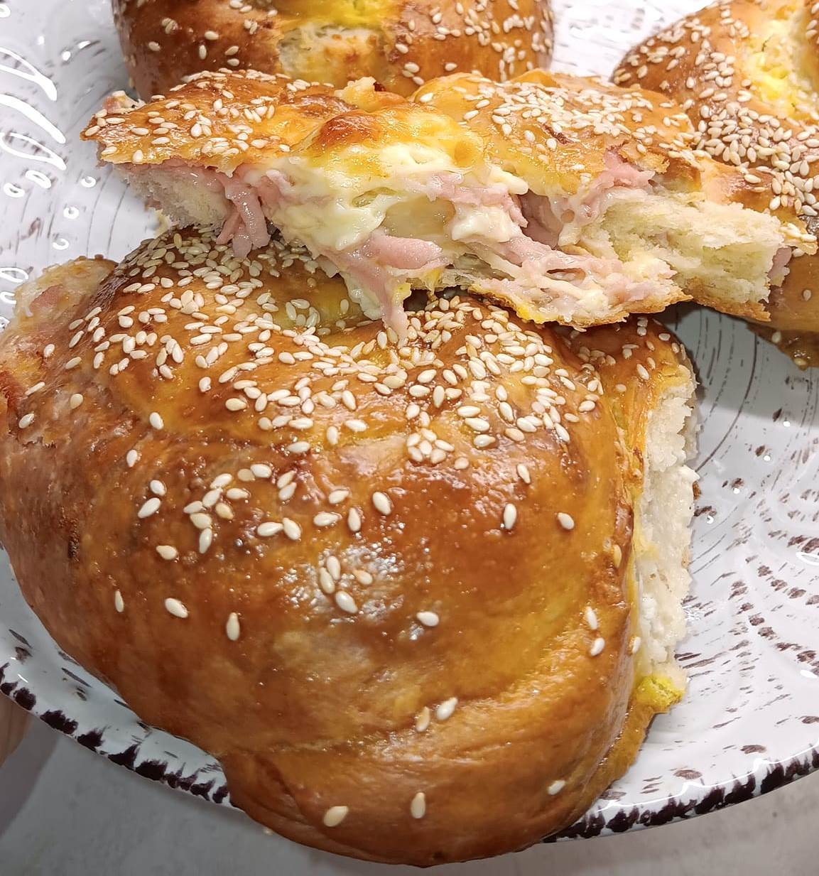 Ανακατεύουμε τα υλικά σε ένα μπολ κ πλαθουμε λίγο. Μαλακή ζύμη όχι παραπάνω αλεύρι από αυτό. Αφήνουμε να ξεκουραστεί μισή ώρα. Μετά χωριζουμε σε 8 μπαλάκια ανοίγουμε με λαδωμένα χέρια και βάζουμε μέσα ότι μας αρέσει το κλείνουμε σα ρολάκι το στρίβουμε σαλιγκαράκι αλοιφουμε με το κροκο κ ρίχνουμε σουσαμι. Φούρνο 190 βαθμούς μέχρι να ροδισουν.