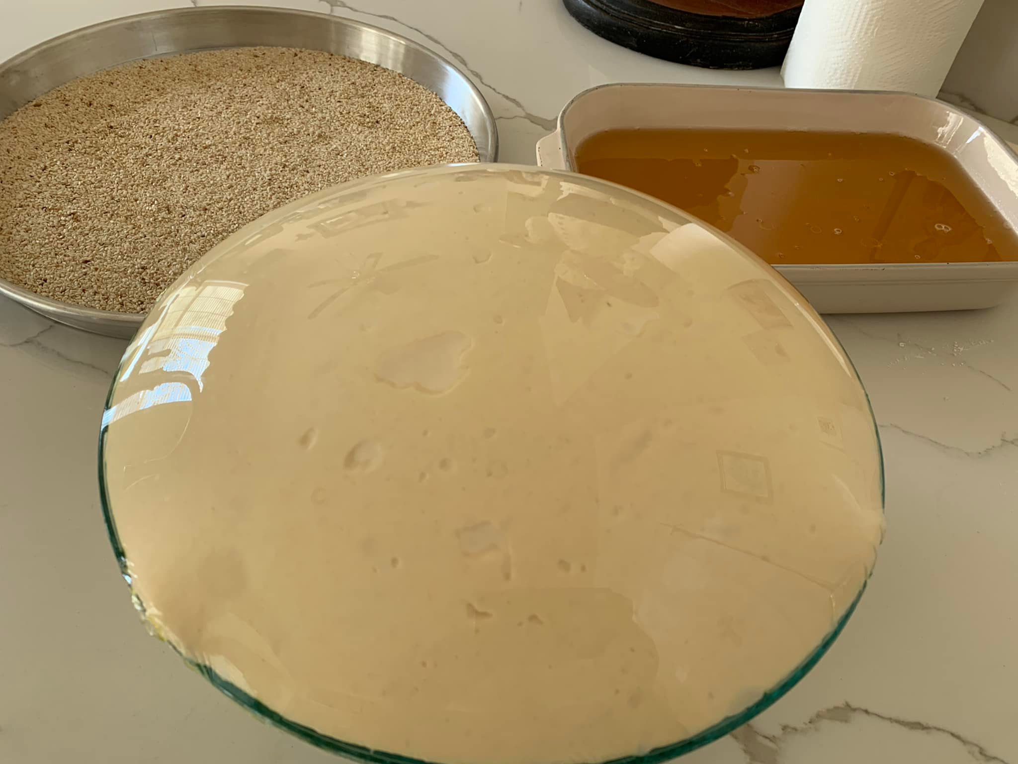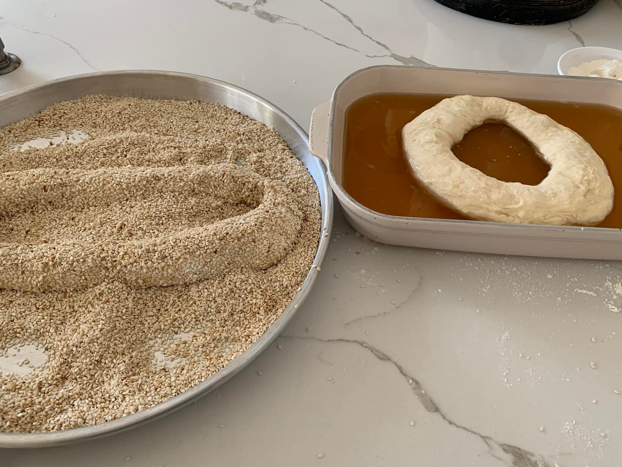 Διαλύουμε σε ένα ταψί το μέλι στο νερό και σε ένα άλλο ταψί βάζουμε το μείγμα σουσάμι και τη ζάχαρη.