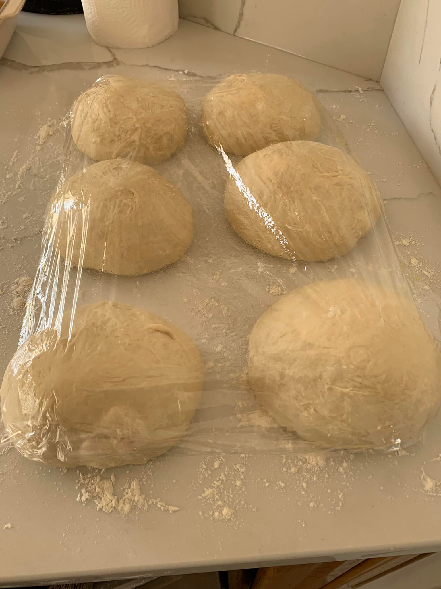 Πασπαλίστε την επιφάνεια εργασίας σας με αλεύρι. Χωρίζουμε τη ζύμη σε 6 μπάλες.