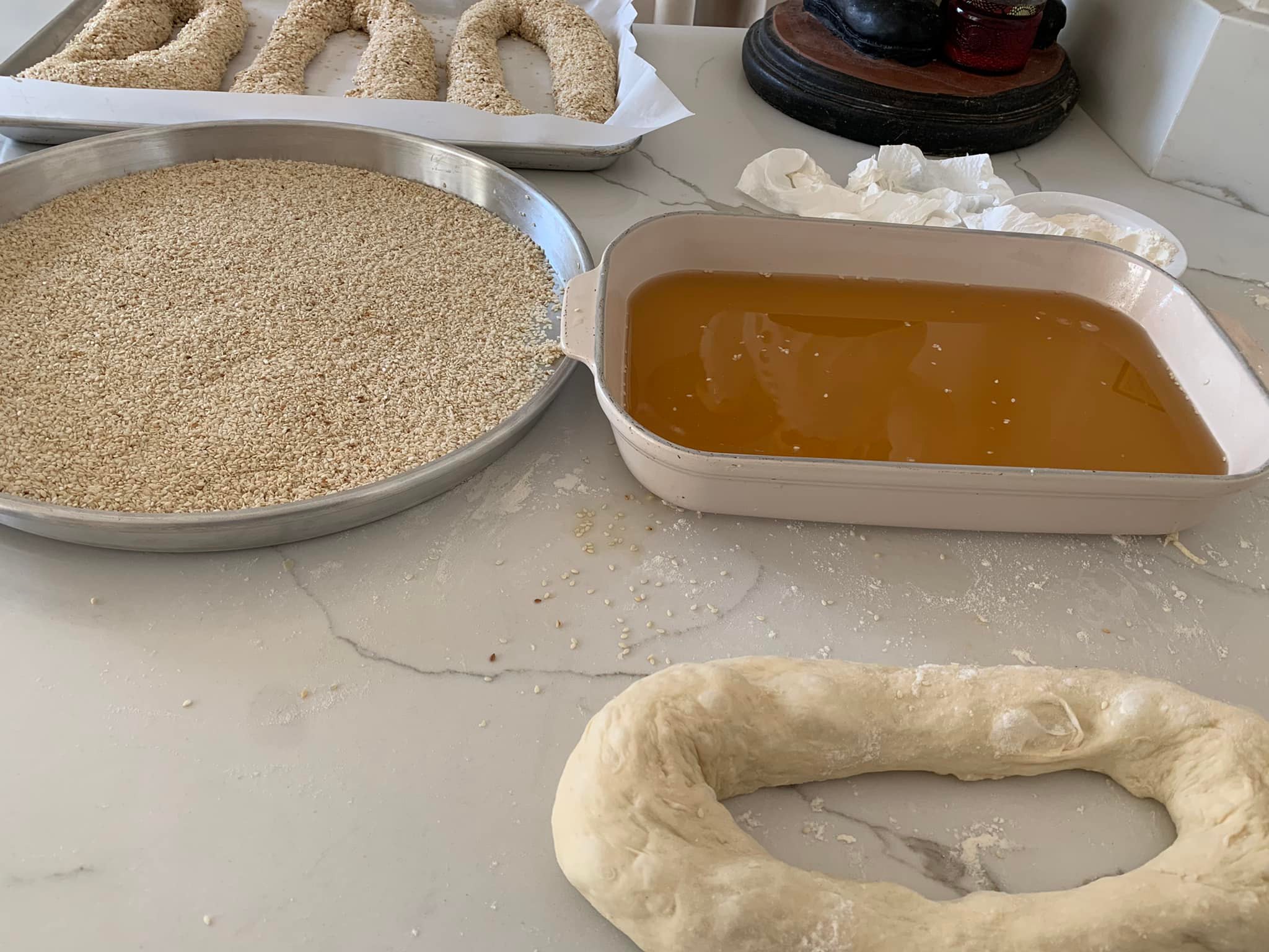 Τοποθετήστε τα κουλούρια στο μειγμα νερού και μελι και μετα στο μειγμα με το σουσάμι ζαχαρη και με τα βάζουμε σε ένα ταψί που έχουμε στρωσει με λαδόκολλα