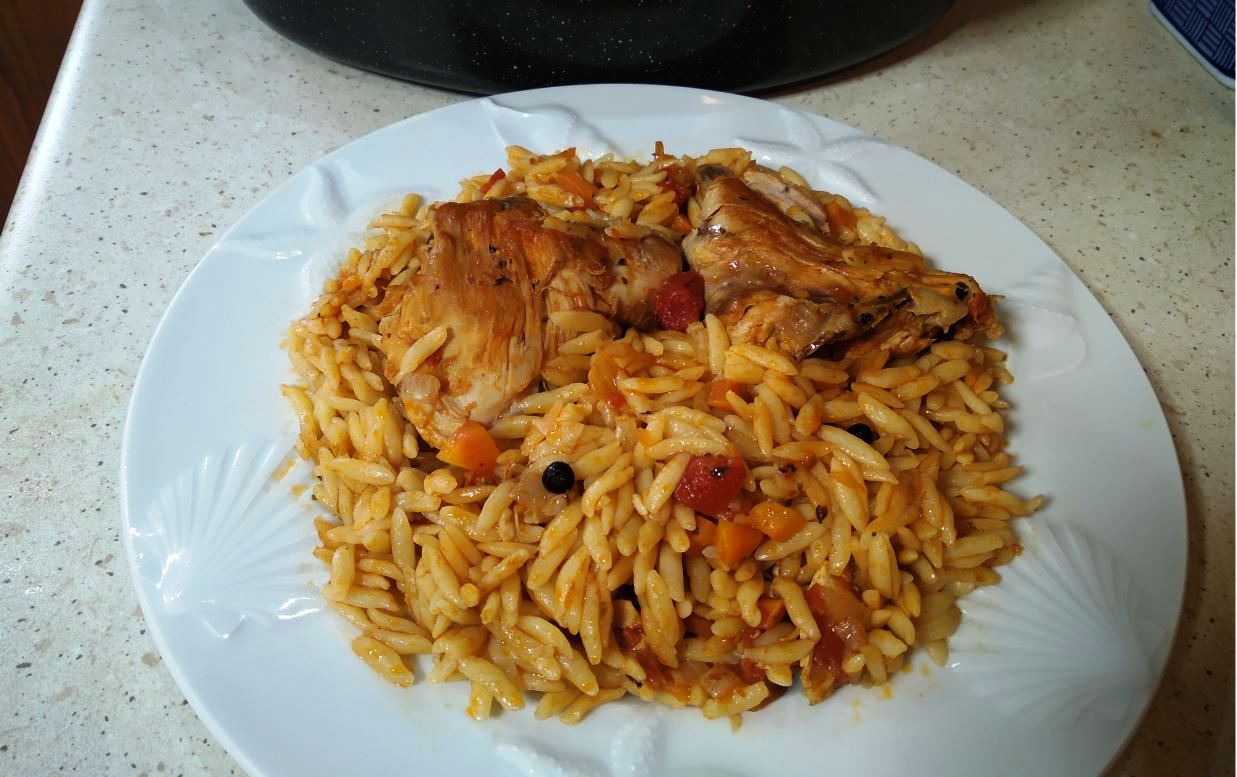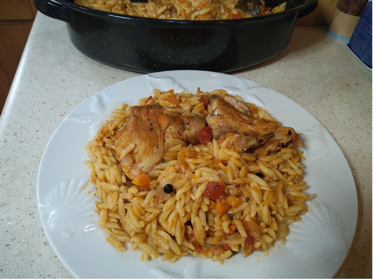 Προσθέτουμε και τα μπαχάρια την δάφνη αλάτι και πιπέρι.Σιγοβράζουμε για 40 λεπτά.Καβουρντίζουμε το κριθαράκι 2 με 3 λεπτά το ρίχνουμε στο ταψί βάζουμε και το κοτόπουλο περιχύνουμε με την σάλτσα και αν χρειαστεί προσθέτουμε και λίγο νεράκι ζεστό να σκεπάζει το κριθαράκι .
