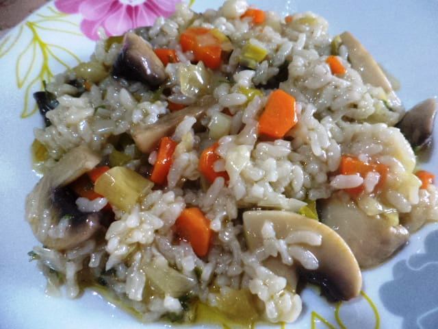Σοτάρισα το κρεμμύδι ψηλοκομένο, πράσα κομμενα σε ροδέλες, καρότα κομμενα μισοφέγγαρα, μανιτάρια κομμένα φέτες και έπλυνα το ρύζι. Τα έριξα σε ταψί, έριξα χλιαρό νερό περιπου 3-4 ποτήρια, προσθέτω αλάτι και τα μυρωδικά μαγείρεψα στο