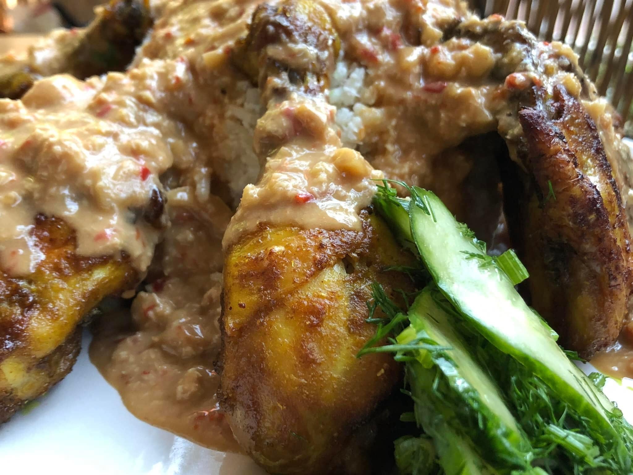 Σε μια μεγάλη πιατέλα, τοποθετούμε το ζεστό ρύζι, στη συνέχεια το ρίχνουμε με τα υγρά και τραγανά κομμάτια κοτόπουλου και περιχύνουμε με μέτρο τη σάλσα και διακοσμούμε την πιατέλα με τα αγγουρaκια και σερβίρουμε και απολαμβάνουμε αυτή τη μεγάλη ινδονησιακή σπεσιαλιτέ.