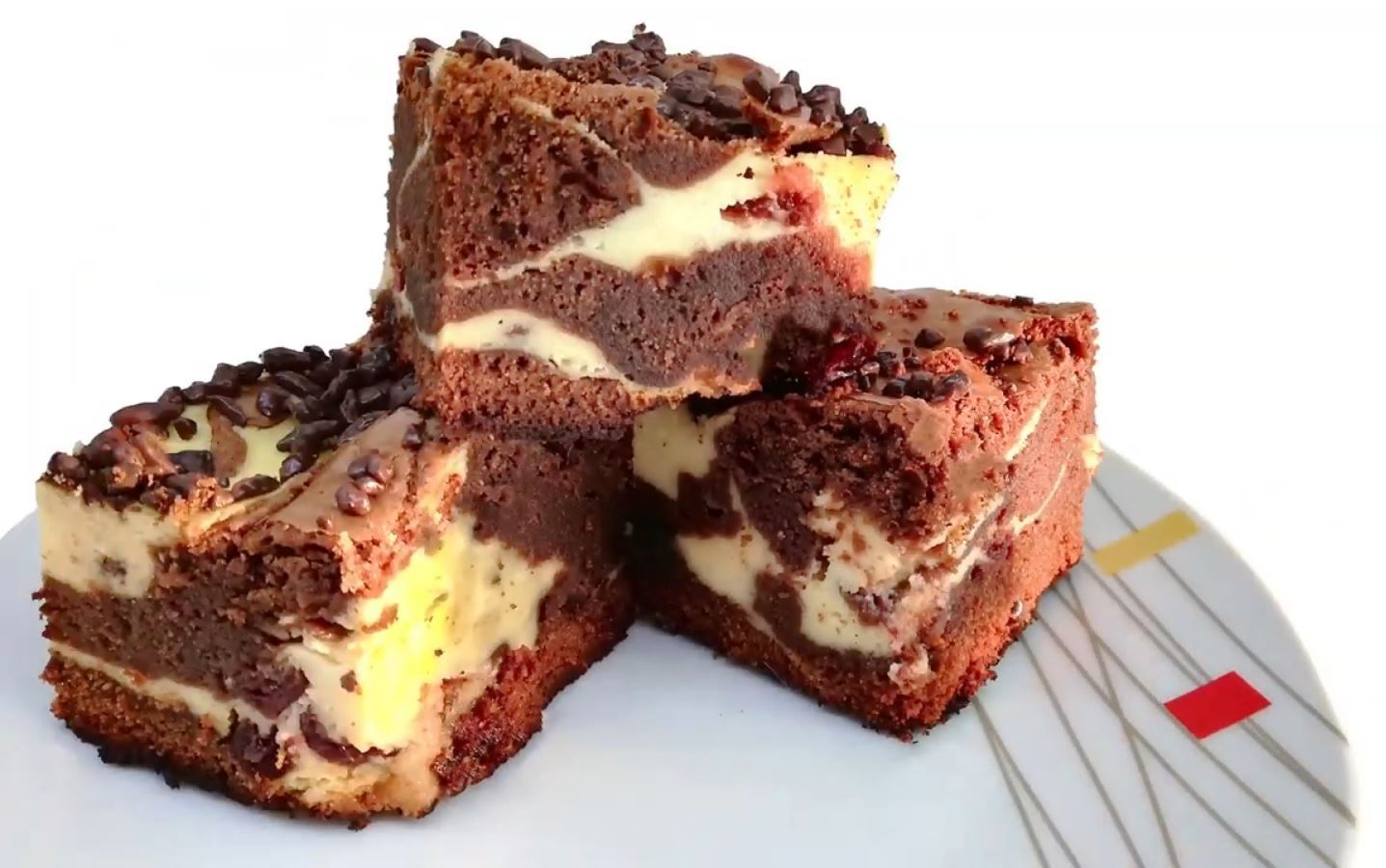 Ρίξτε περίπου τα 2/3 της σύνθεσης μαυρης σοκολάτας σε ένα ταψί (25/35 cm) επενδεδυμένο με χαρτί ψησίματος. Απλώστε το τυρί κρέμα στην κορυφή, βάζοντας με ένα κουτάλι εδώ και εκει. Τοποθετήστε και την υπόλοιπη σύνθεση σοκολάτας πάνω από το τυρί κρέμας.