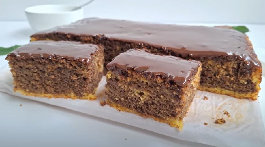 Ψήνουμε στους 180°C για 30 λεπτά. Μόλις ψηθεί, καλύπτουμε με τα 200 γρ. λιωμένη σοκολάτα γάλακτος.