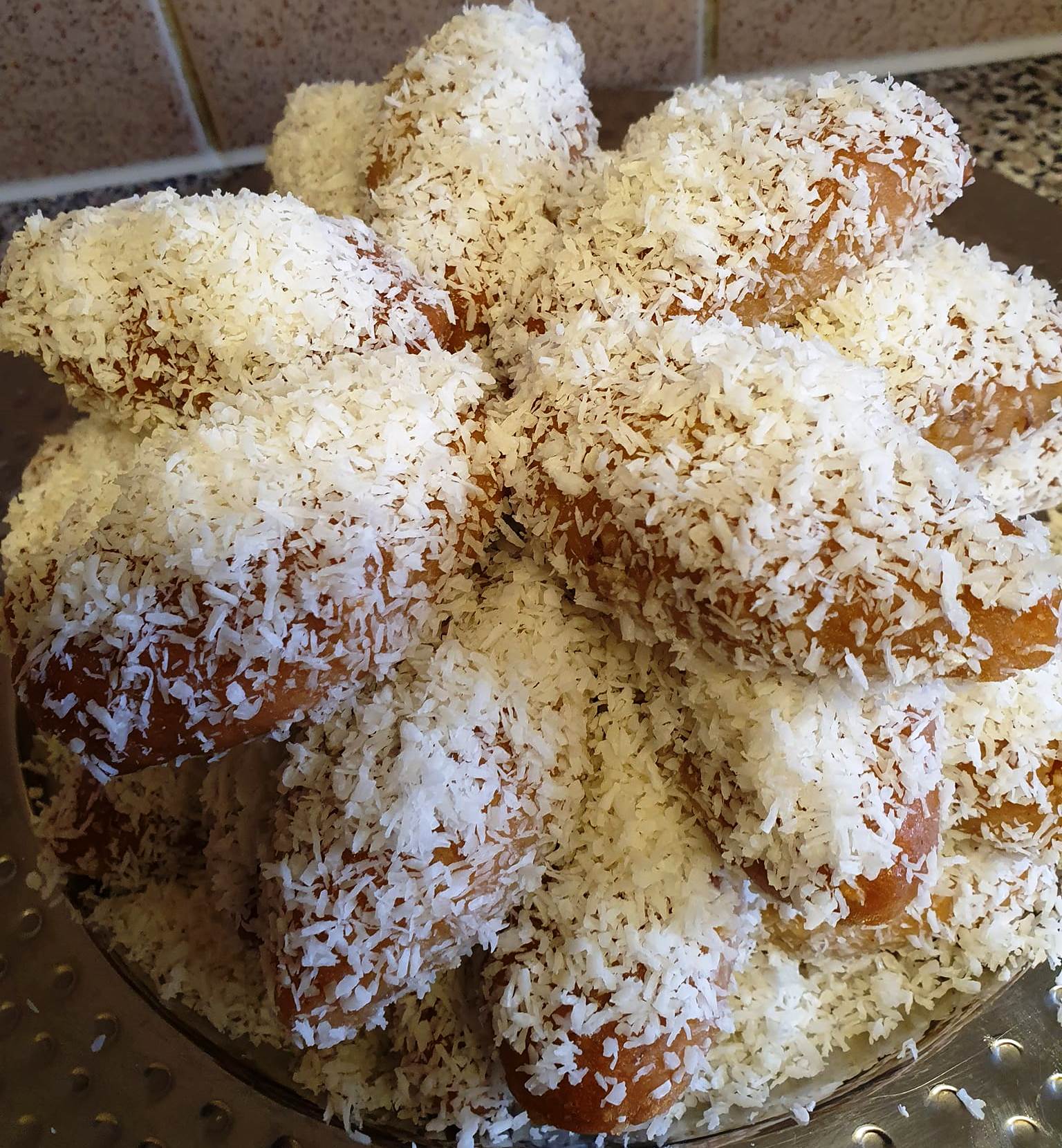 Τοποθετούμε τα γλυκάκια σε ένα ταψί και τα ψήνουμε σε μέτριο φούρνο για περίπου 25 με 30 λεπτά, ή μέχρι να ροδίσουν ελαφρά και να ψηθούν σωστά. Παράλληλα, έχουμε ετοιμάσει το σιρόπι. Μόλις βγουν τα γλυκάκια καυτά από το φούρνο, τα σιροπιάζουμε αμέσως, βουτώντας τα στο ζεστό σιρόπι. Αμέσως μετά, τα τυλίγουμε γενναιόδωρα με τριμμένη καρύδα.