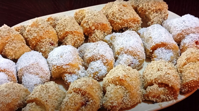 – Παίρνουμε λίγη από την ζύμη, την απλώνουμε κυκλικά, την κόβουμε σε 8 τρίγωνα, βάζουμε λίγη μαρμελάδα σε κάθε τρίγωνο και την τυλίγουμε
