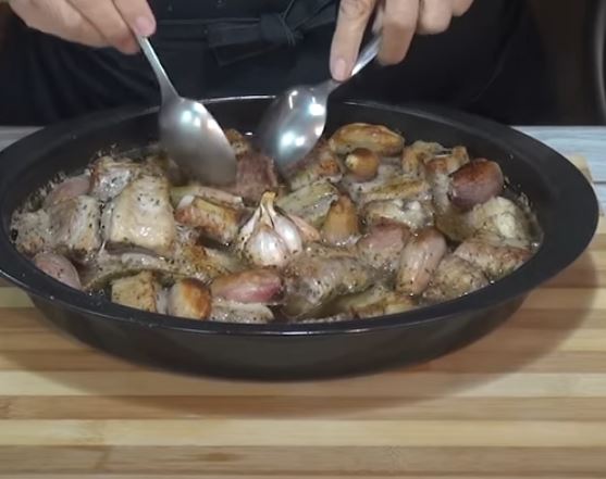 Ψήνουμε σε προθερμασμένο φούρνο στους 190 βαθμούς για 35 λεπτά. Βγάζουμε από φούρνο γυρνάμε το κρέας και τα κρεμμύδια από την άλλη πλευρά
