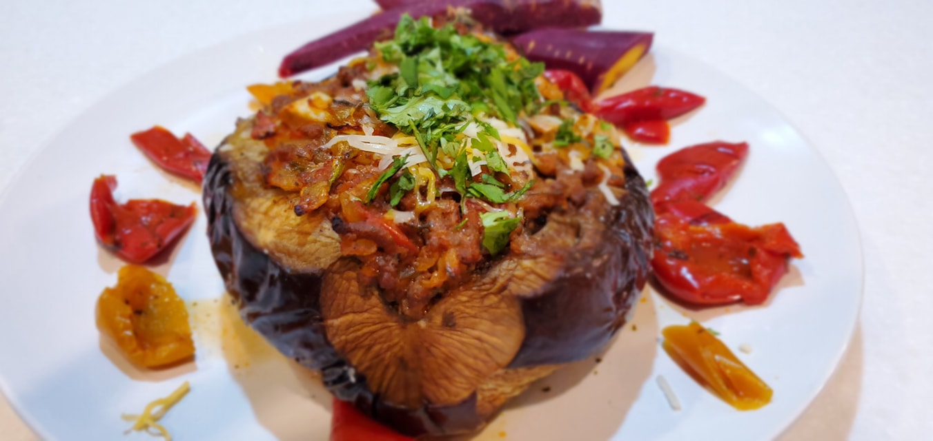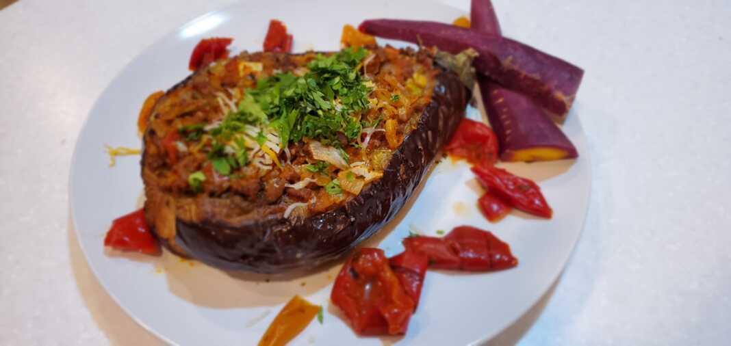Γεμίζουμε τη μελιτζάνα με γέμιση και την ξαναβάζουμε στο φούρνο για 10 λεπτά για να ξαναζεσταθεί.