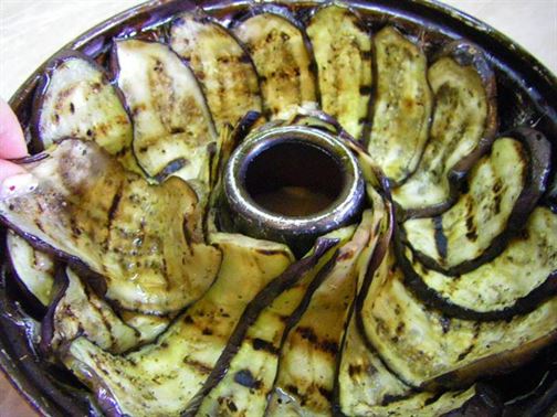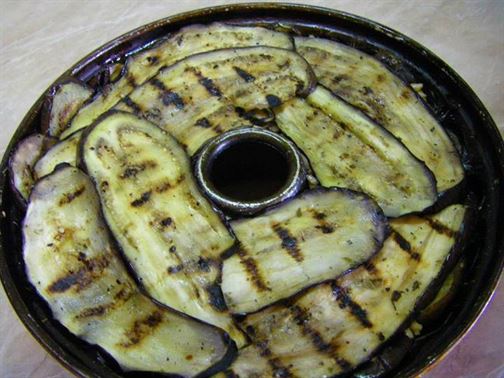 Ψήστε τις μελιτζάνες στη σχάρα ή σε στεγνό τηγάνι από τεφλόν. Λαδώνουμε μια φόρμα για κέικ και τακτοποιούμε τις μελιτζάνες σε σχήμα βεντάλιας.
