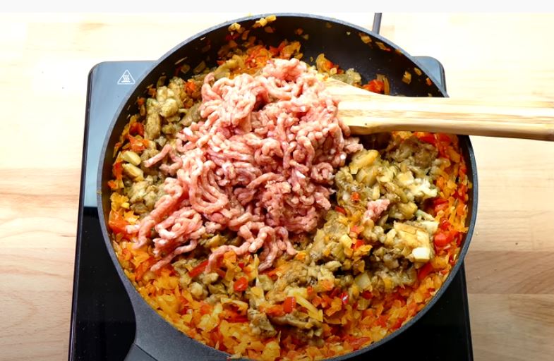 που είχαμε προηγουμένως ψιλοκόψει. Ανακατέψτε με τα υπόλοιπα λαχανικά και προσθέστε τους κιμάδες και αλατίζουμε.