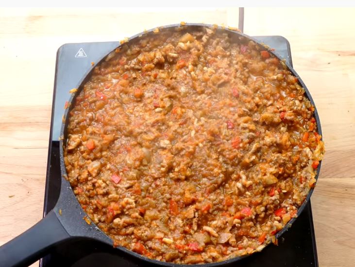ή μια κουταλιά της σούπας ρίγανη. Ανακατεύουμε και ενσωματώνουμε όλα τα συστατικά και στη συνέχεια αφήνουμε τα πάντα να μαγειρεύουν σε χαμηλή φωτιά για περίπου 30 λεπτά. Μέχρι να εξατμιστεί όλο το νερό που έχει απελευθερώσει τον κιμά και την ντομάτα