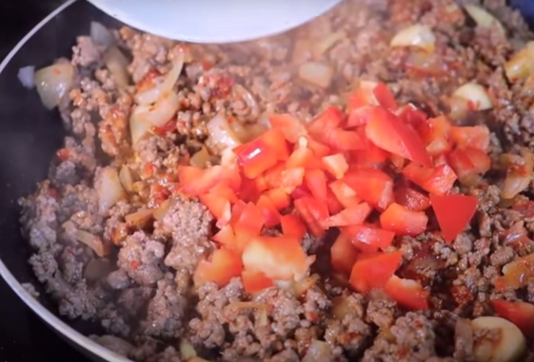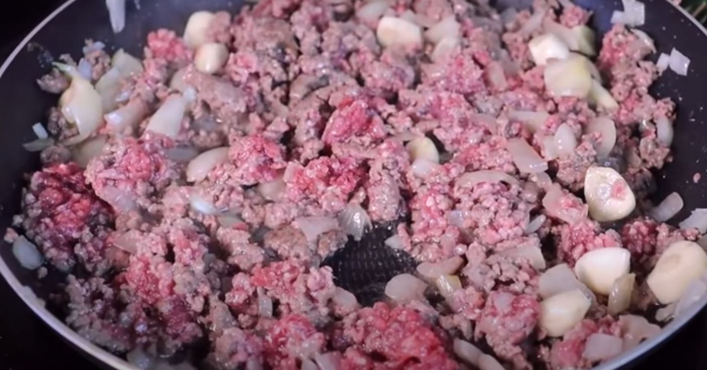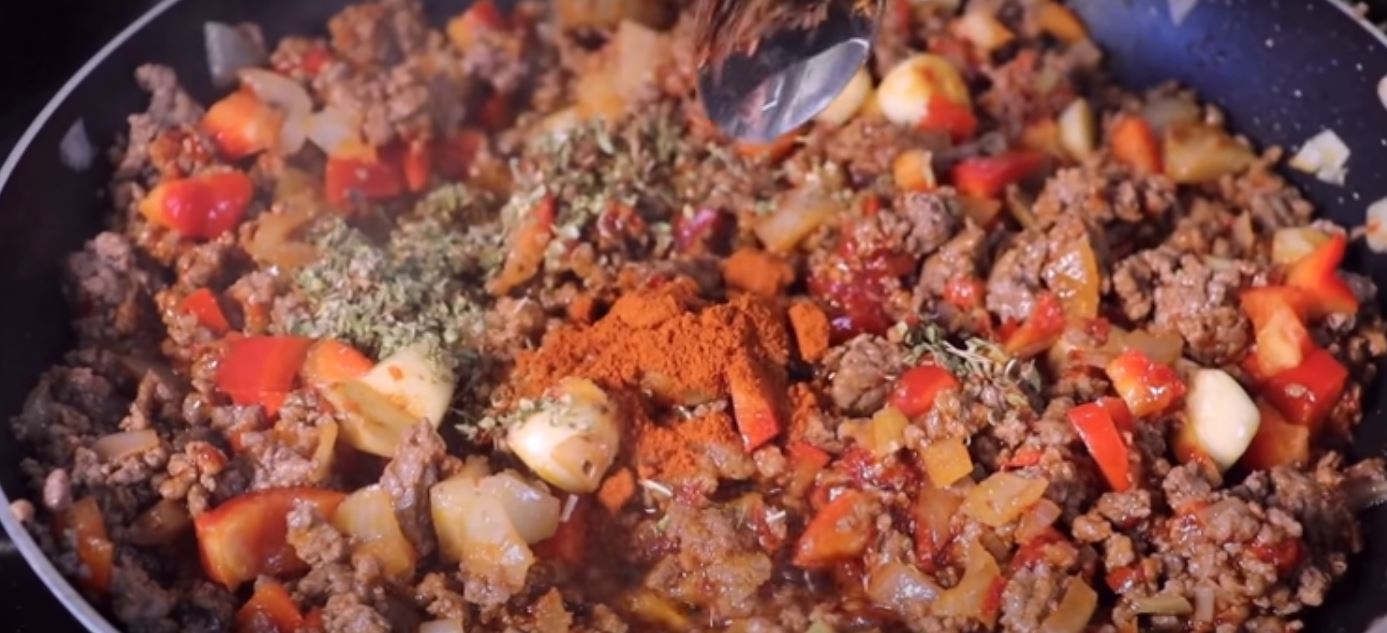 Βάζουμε ένα μεγάλο τηγάνι σε δυνατή φωτιά ρίχνουμε 4 κουταλιές της σούπας λάδι και ρίχνουμε πρώτα το κρεμμύδι μετά το σκόρδο, σοτάρουμε για 3 λεπτά και προσθέτουμε τον κιμά.