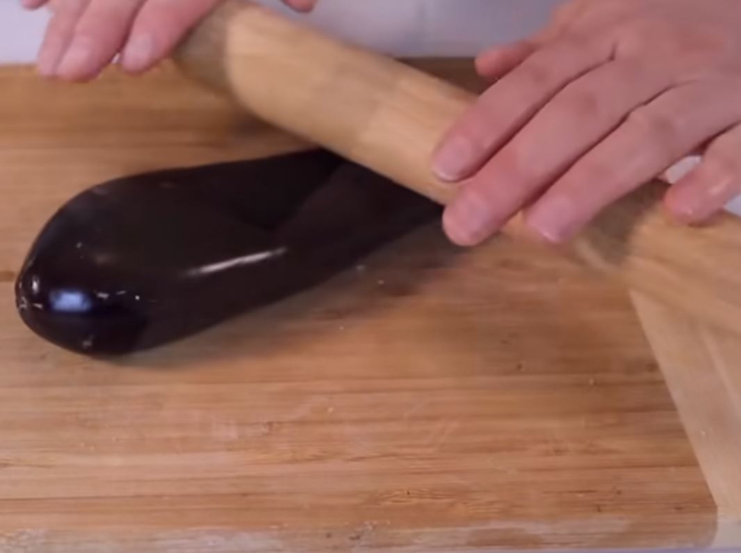 Παίρνουμε τις μελιτζάνες και τις πιέζουμε δυνατά με έναν πλάστη ώστε να μαλακώσουν και να λεπτύνουν.