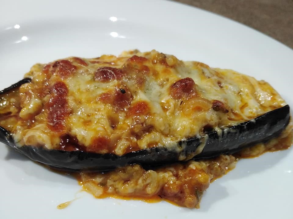 Στη συνέχεια γεμίζουμε τις μελιτζάνες με τη γέμιση και, και πασπαλίζουμε με τριμμένο κίτρινο τυρί.