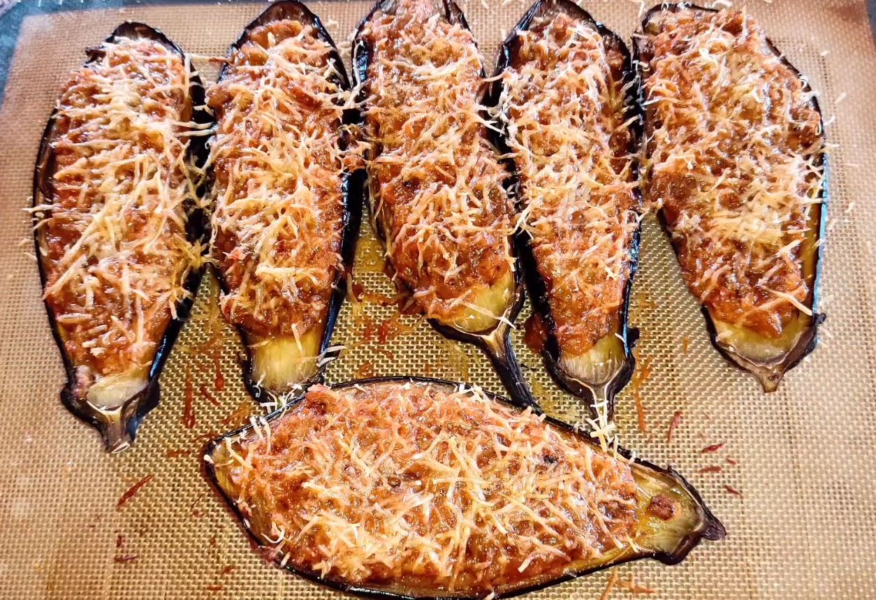 Γεμίζουμε τις μελιτζάνες μας και τρίβουμε τυρι απο πανω(εγω εβαλα παρμεζανα).Ψήνουμε στους 200 βαθμούς για περίπου 15 λεπτα ακόμη.