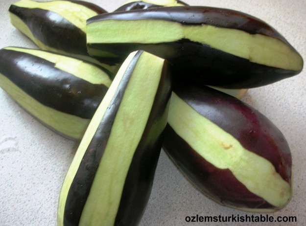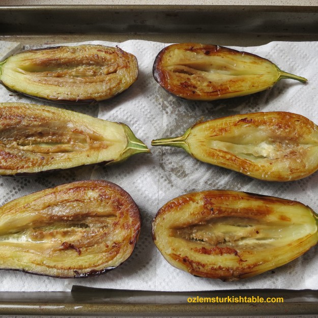 και στη συνέχεια κόψτε τις μελιτζάνες στη μεση κατά μήκος. Σε κάθε μισό μελιτζάνας, κόψτε μια βαθιά στην μέση κατα μήκος χωρίς να κόψετε μεχρι κάτω και αφηνοντας λιγο από κάθε άκρο. Πασπαλίστε με αλάτι (αυτό θα βοηθήσει την υγρασία να ψύγει) πάνω από τις μελιτζάνες και αφήστε για περίπου 10-15 λεπτά για να φύγει η υγρασία και να ξεπικρίσουν. Μετά από αυτό, αποστραγγίστε καλά και στεγνώστε τις μελιτζάνες με χαρτοπετσέτα.