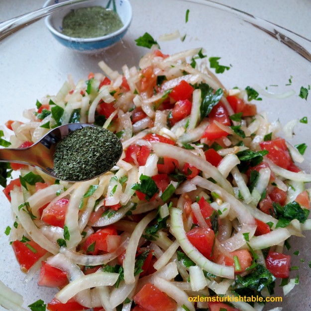 Ζυμώνουμε αυτό το μίγμα με τα χέρια σας για να συνδυαστούν καλά η αποξηραμένη μέντα αλάτι και πιπέρι (αυτό θα βοηθήσει επίσης τα κρεμμύδια να μαλακώσουν). Ανακατέψτε τις ντομάτες και το μαϊντανό στο μείγμα και συνδυάστε καλά.