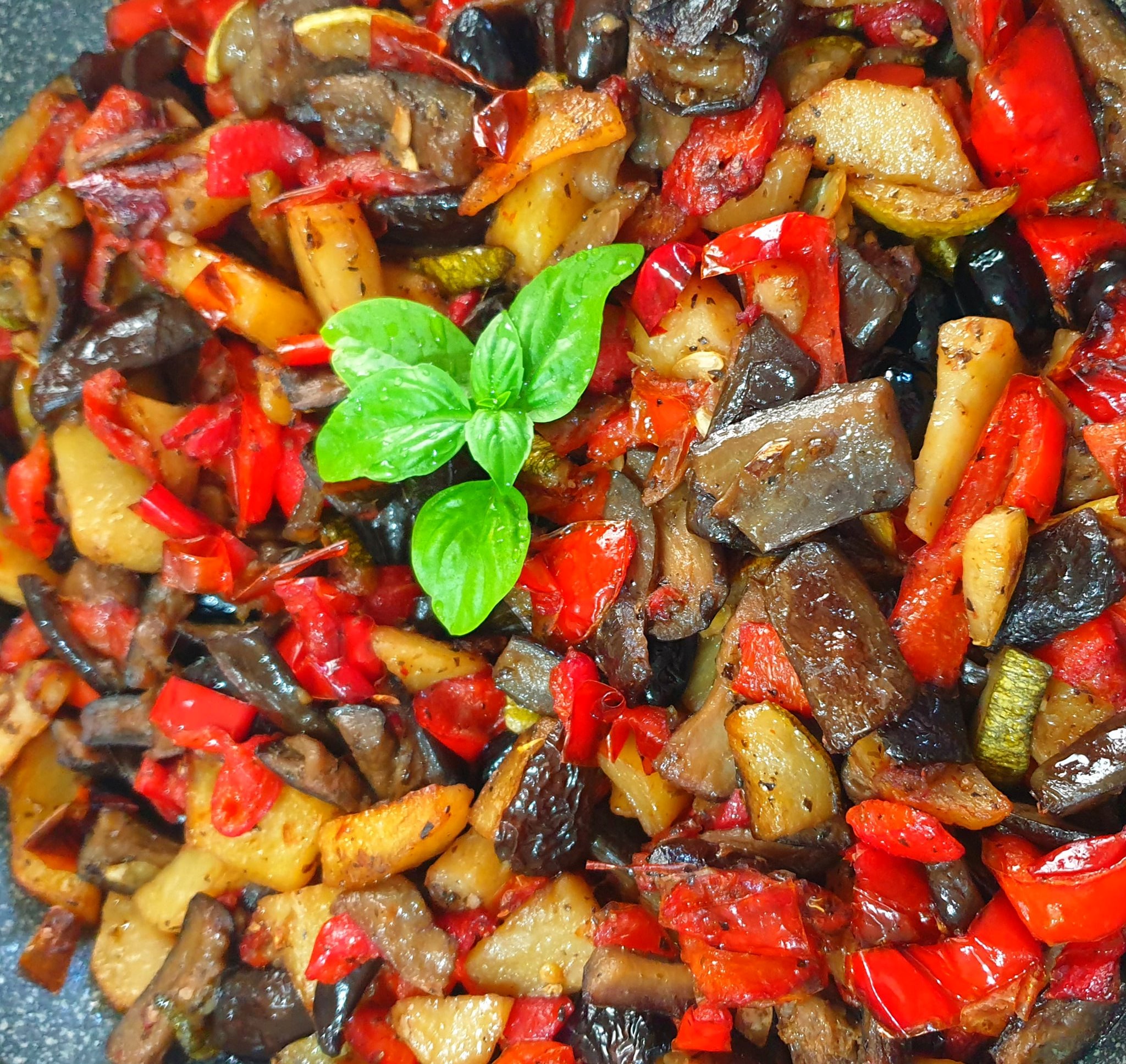 Ζουμερές μελιτζάνες, πολύχρωμες πιπεριές, κολοκυθάκια και κρεμμύδια ψήνονται σε υψηλή θερμοκρασία, αναδεικνύοντας τη φυσική τους γλυκύτητα και δημιουργώντας μια λαχταριστή καραμελωμένη κρούστα.