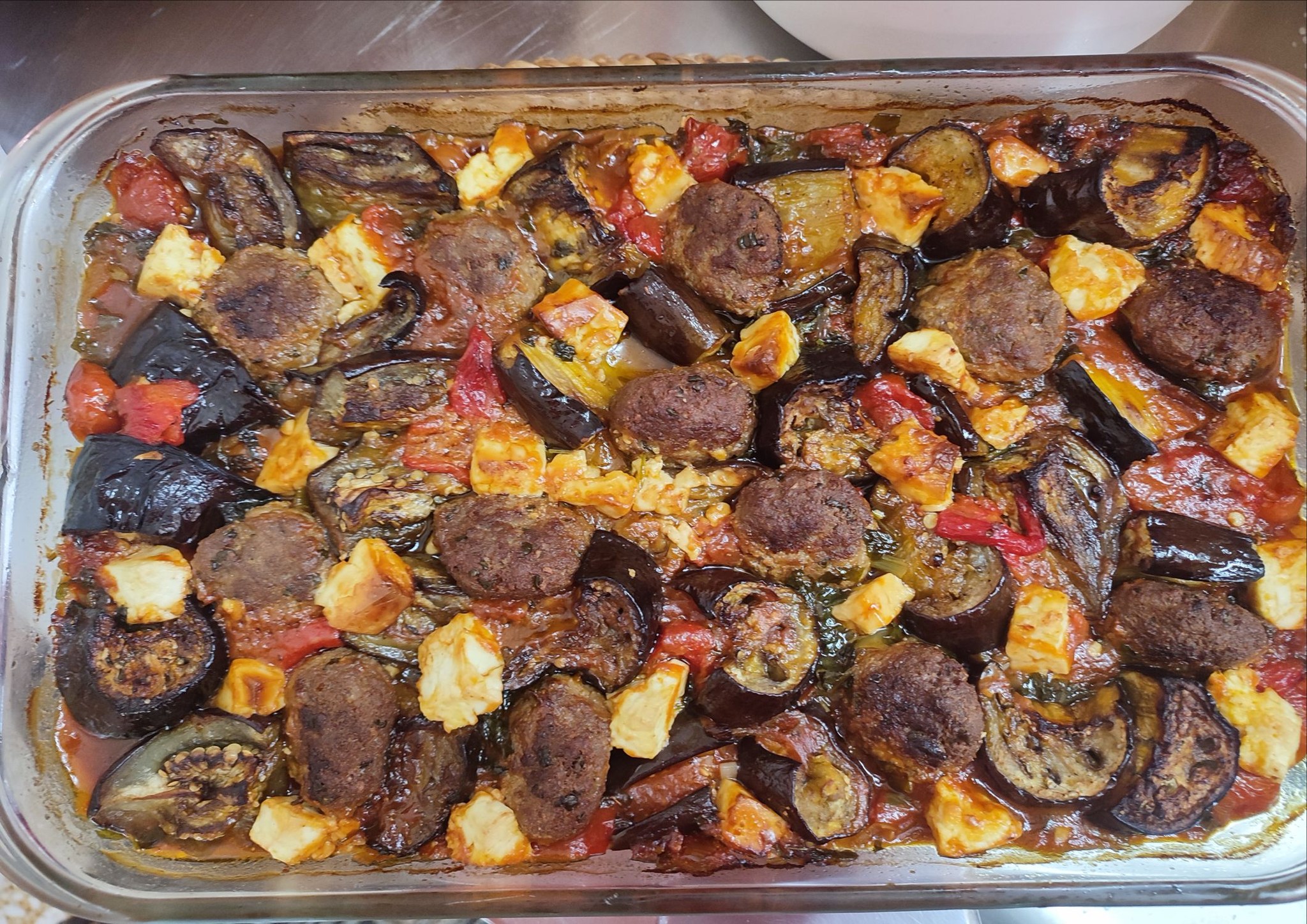 Είχα έτοιμη τη ζύμη του κιμά από χθές βράδυ και αφού τηγάνισα τους κεφτέδες, έστρωσα πρώτα τη σάλτσα, μετά τις μελιτζάνες και την πιπεριά Φλωρίνης σε κομμάτια, ύστερα τους κεφτέδες και τέλος μπουκιες τυρί φέτα.
