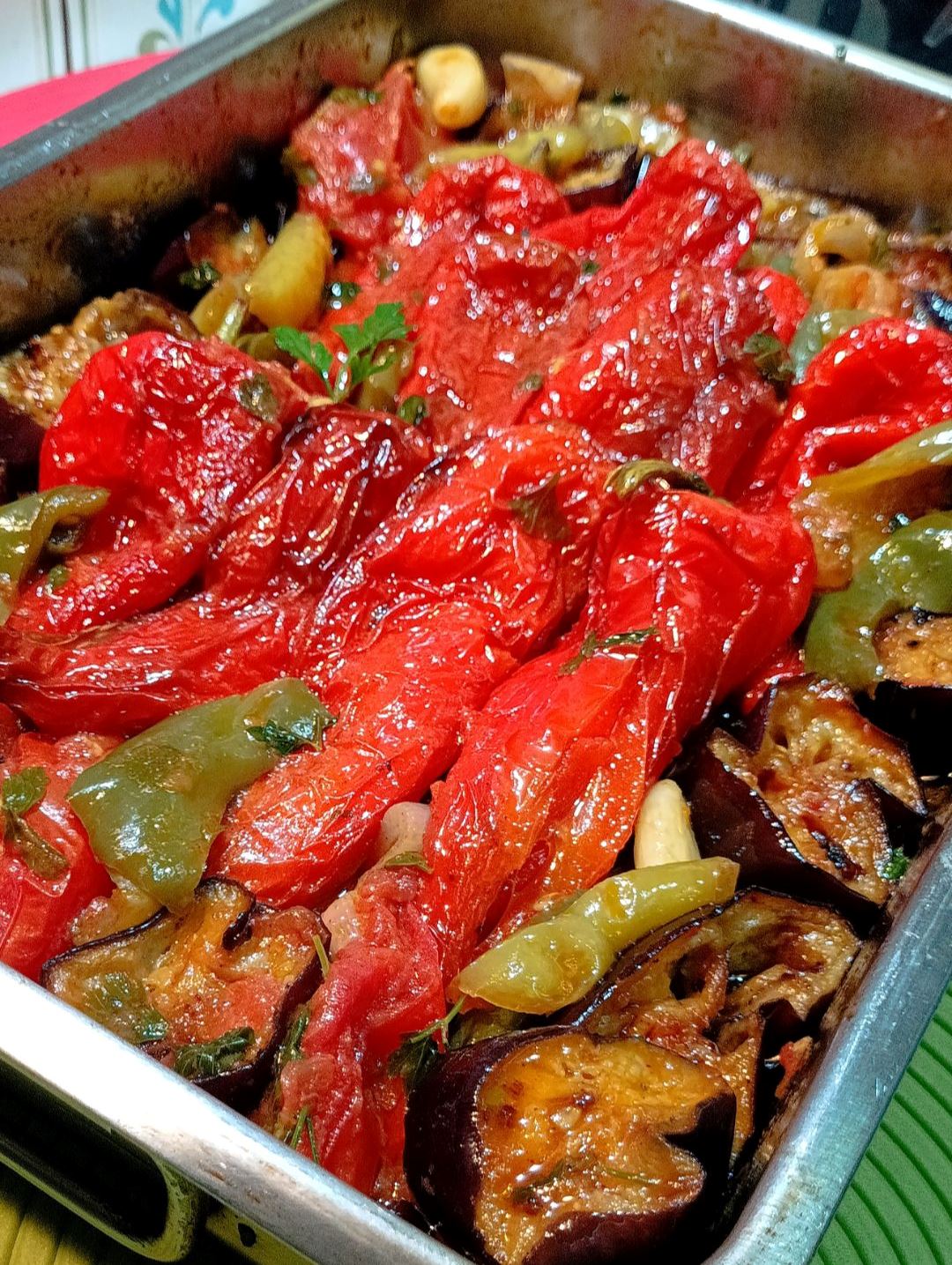 Προτηγάνισα μελιτζάνες μεγάλες, λίγες πρ. πιπεριές σε κομμάτια και μπόλικες ολόκληρες Φλωρίνης. Τις έβγαλα σε απορ. χαρτί κουζίνας. Στο ίδιο τηγάνι σοτάρω κρεμμύδια σε φέτες, σκ. σκόρδο. Προσθέτω πελτέ και φρ. ντομάτες τριμμένες και σε μεγάλα κομμάτια. Αλάτι πιπέρι, ρίγανη και λίγο νεράκι να πάρει μια βράση. Τέλος πρόσθεσα τα λαχανικά και έσβησα. Έβαλα στο ταψί το φαγητό και το πασπάλισα με ψιλοκομμένο μαϊντανό. Λίγο νερό κι έψησα μέχρι να μείνει με τη σάλτσα του! ❤️