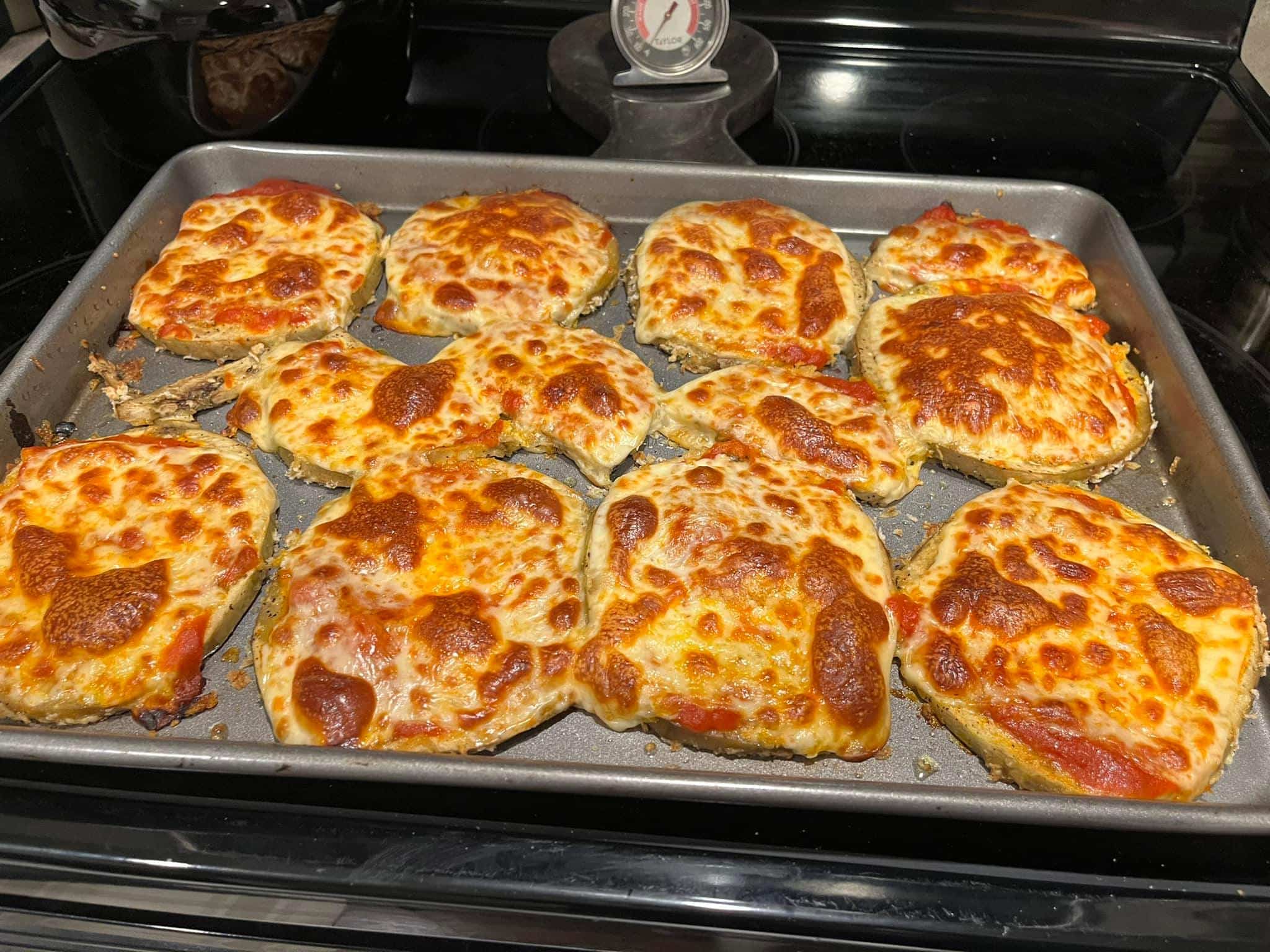 Βάλτε τη σάλτσα πάνω στη μελιτζάνα και μετά σε κάθε μια φέτα μοτσαρέλα.
