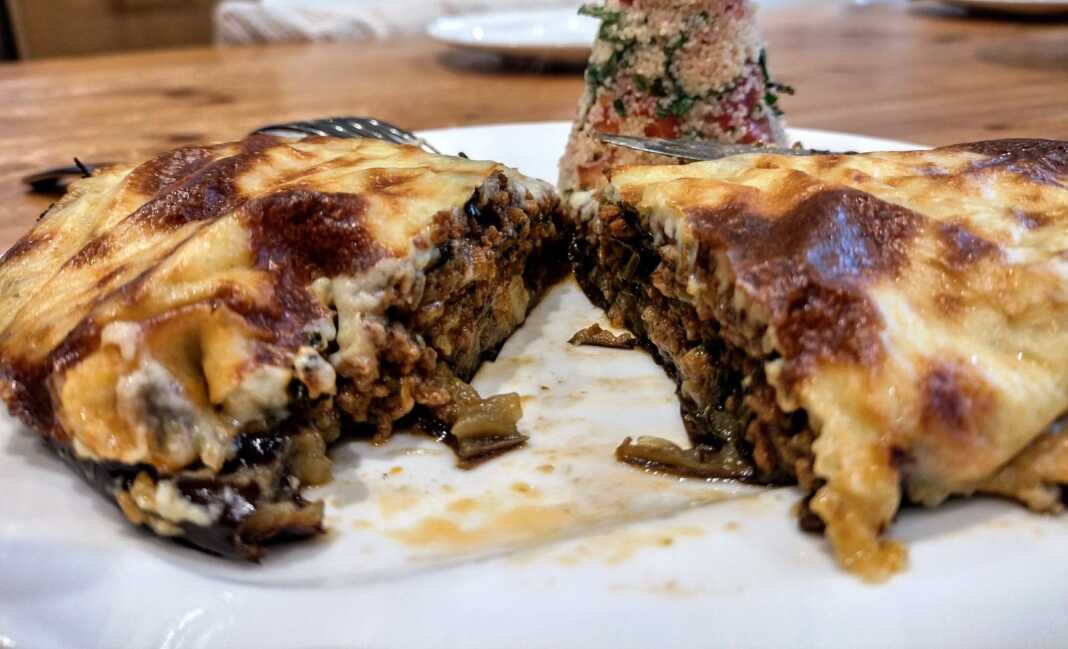 4) Συναρμολογήστε τοποθετώντας τη μισή μελιτζάνα στο κάτω μέρος, γεμίζοντας με κρέας και ρίχνοντας τη σάλτσα από πάνω. Ολοκληρώστε προσθέτοντας λίγο τυρί (αν δεν το προσθέσατε ήδη στη σάλτσα).