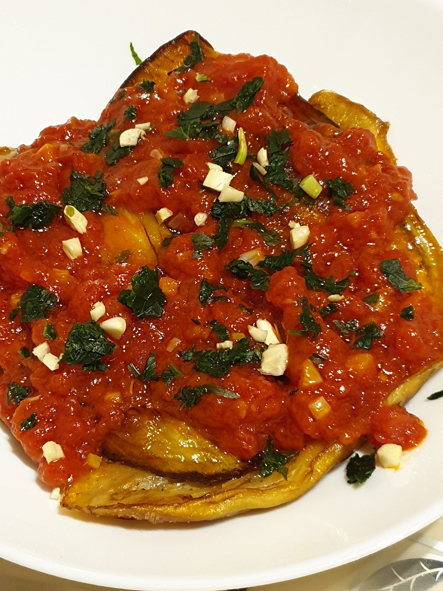 Έριξα στις μισες μελιτζάνες τη σάλτσα και πασπάλισα με σκόρδο και μαϊντανό