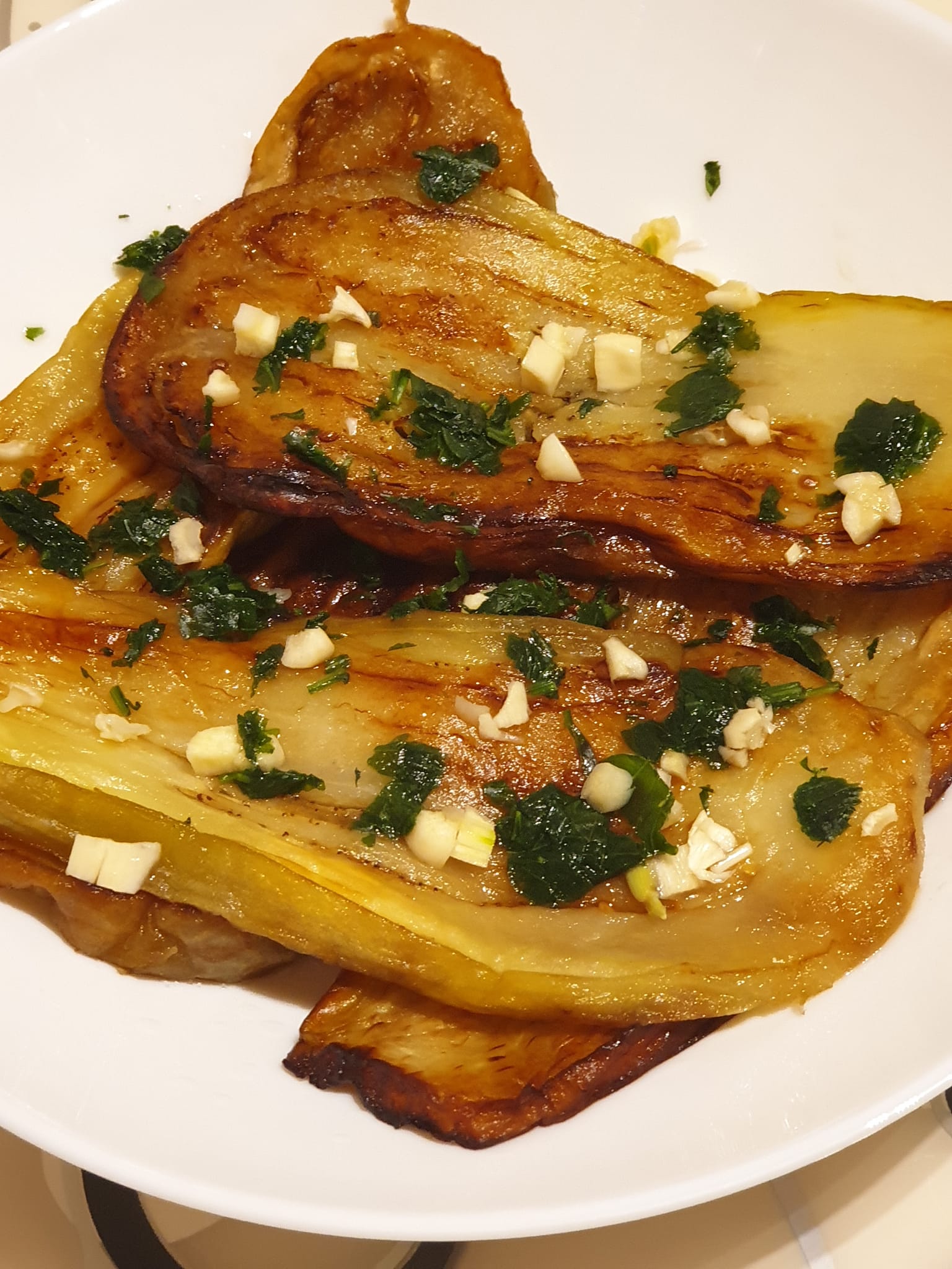 ενω τις άλλες μισες τις αλάτισα, τις πασπαλίσαμε με σκόρδο, μαϊντανό και ξύδι.