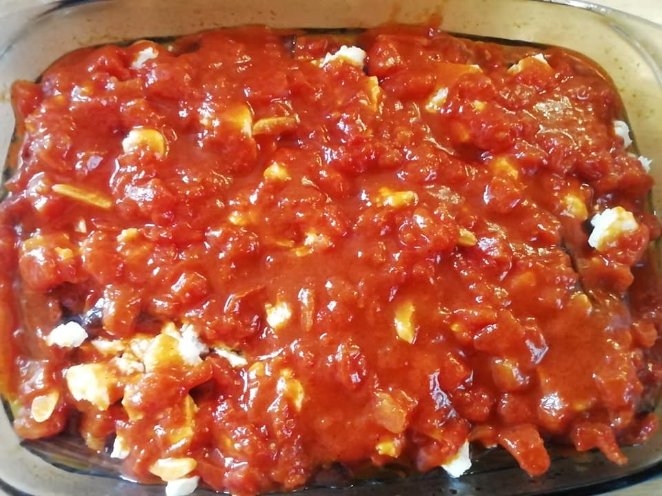 Βγάζω από το φούρνο ρίχνω τυρί φέτα τρίβω με τα δάχτυλα μου πάνω στις μελιτζάνες