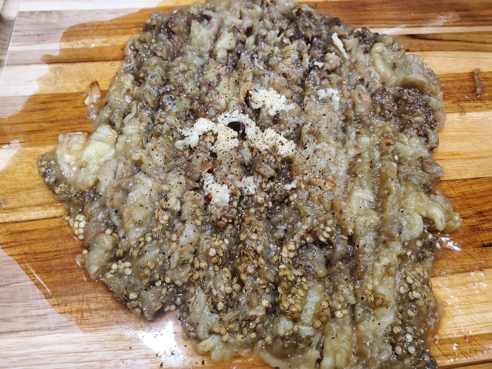 Καθαρίστε τη μελιτζάνα σας όσο είναι ζεστή και μετά την ψιλοκόψτε με το μαχαίρι σας.