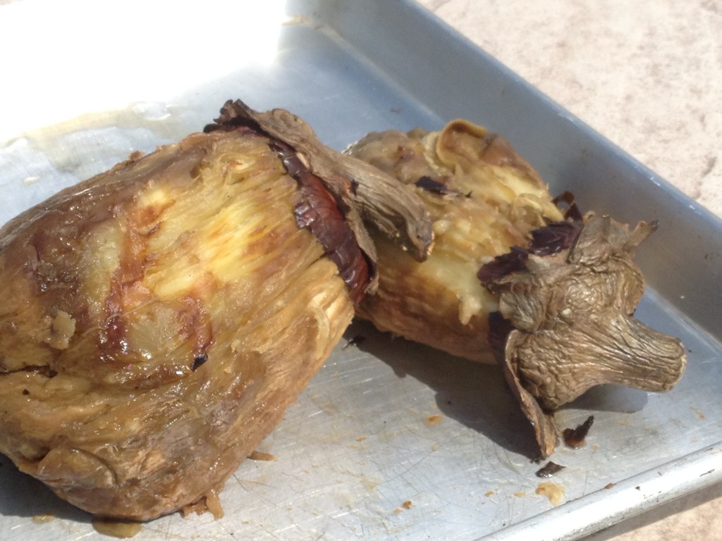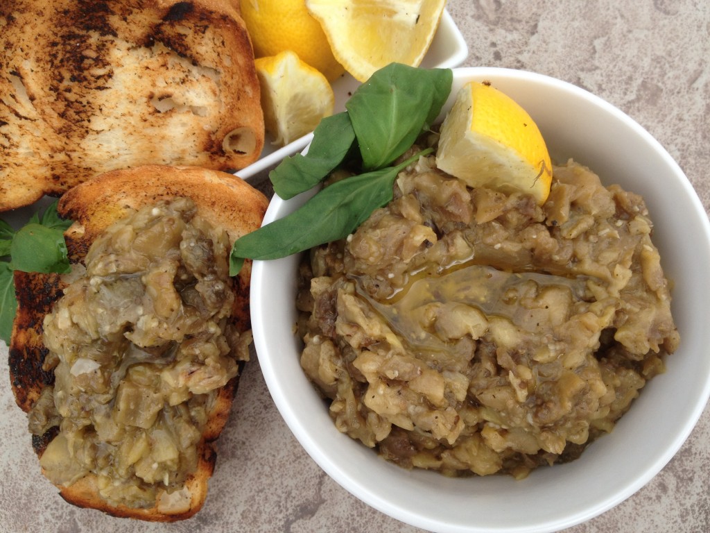 Ψήνουμε στα κάρβουνα ή στο γκριλ 2 μεσαίες μελιτζάνες πάνω από υψηλή φωτιά – τρυπήστε την μελτζάνα πρώτα! Γυρίστε τις μελιτζάνες μέχρι να μαυρισθούν όλες οι πλευρές του φλοιού και οι χυμοί μελιτζανών αρχίζουν να τρέχουν. Χρησιμοποιήστε 2 μικρότερες μελιτζάνες αντί για 1 μεγάλη – θα γίνουν πιο γρήγορα!