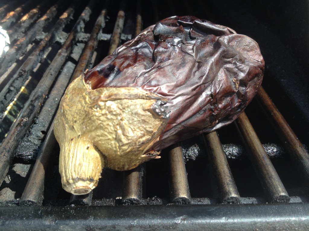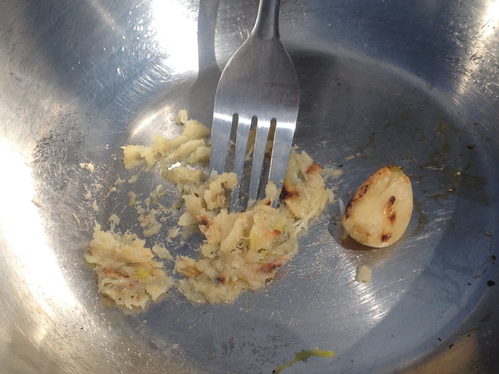 Τυλίξτε 3 μεγάλα σκελίδες σκόρδου σε φύλλο αλουμινίου και προσθέστε το σε σχάρα μέχρι να ψηθούν και να μαλακώσουν. Λιώστε τες με ένα πιρούνι για να πάρετε μια πάστα, προσθέστε 1/2 κουταλάκι αλάτι / πιπέρι και αφήστε το στην άκρη.