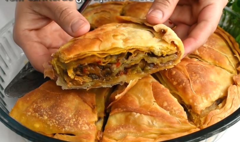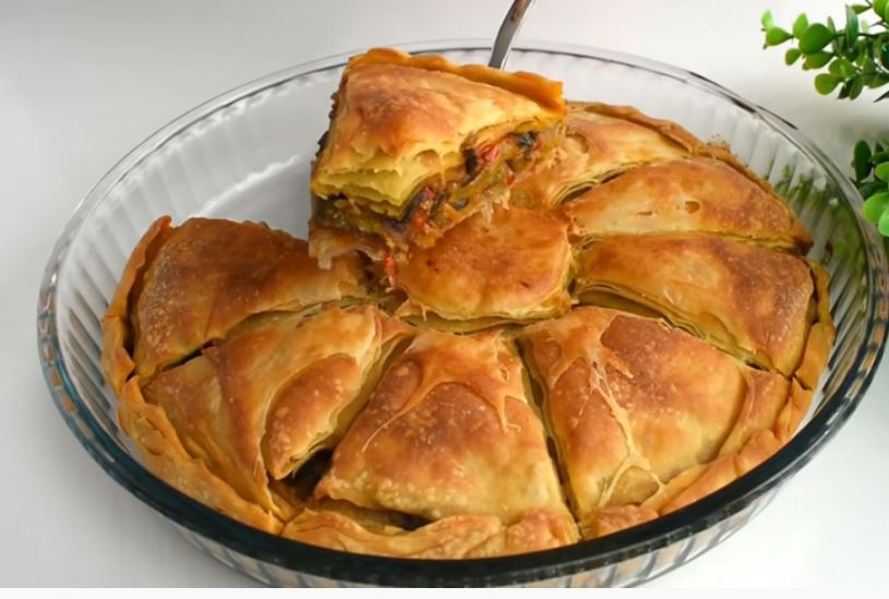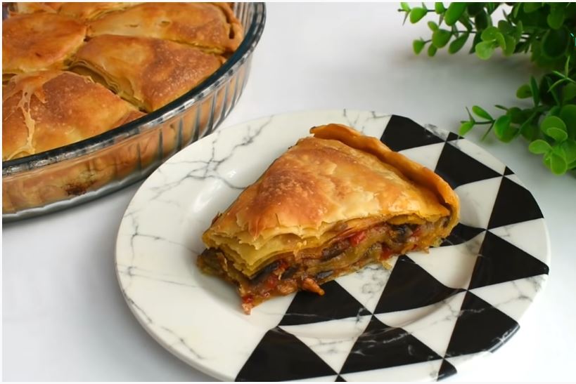 Βάζουμε ένα ποτήρι στο κέντρο του ταψιού και το βυθίζουμε να πάει στον πάτο.Κόβουμε τρίγωνα κομμάτια γύρω γύρω απ το ποτήρι.