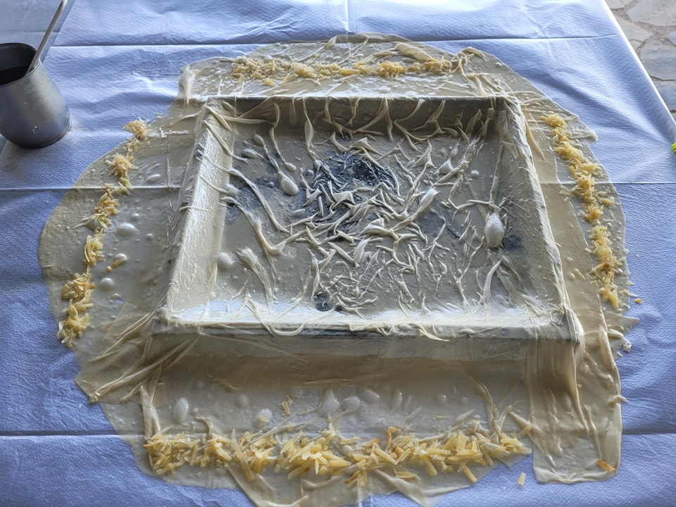 Έκοψα λωρίδες από το υπόλοιπο μισό φύλλο και τις έβαλα ανάμεσα στον πρώτο και δεύτερο κόθρο, έτσι ώστε να έχουν όλα τα κομμάτια 4 φύλλα από πάνω!