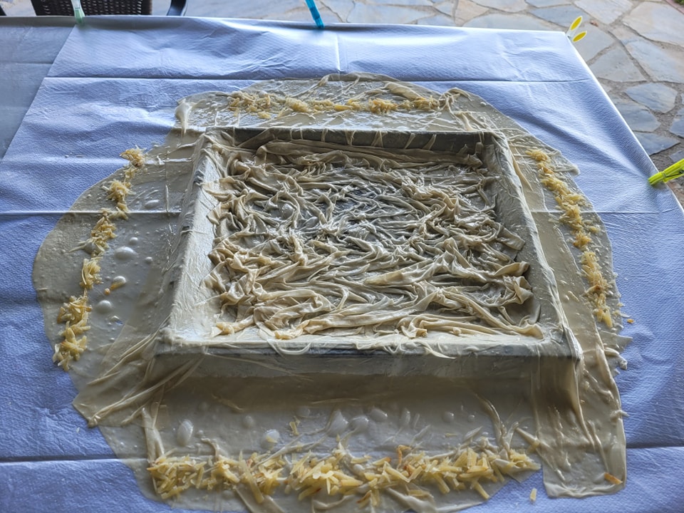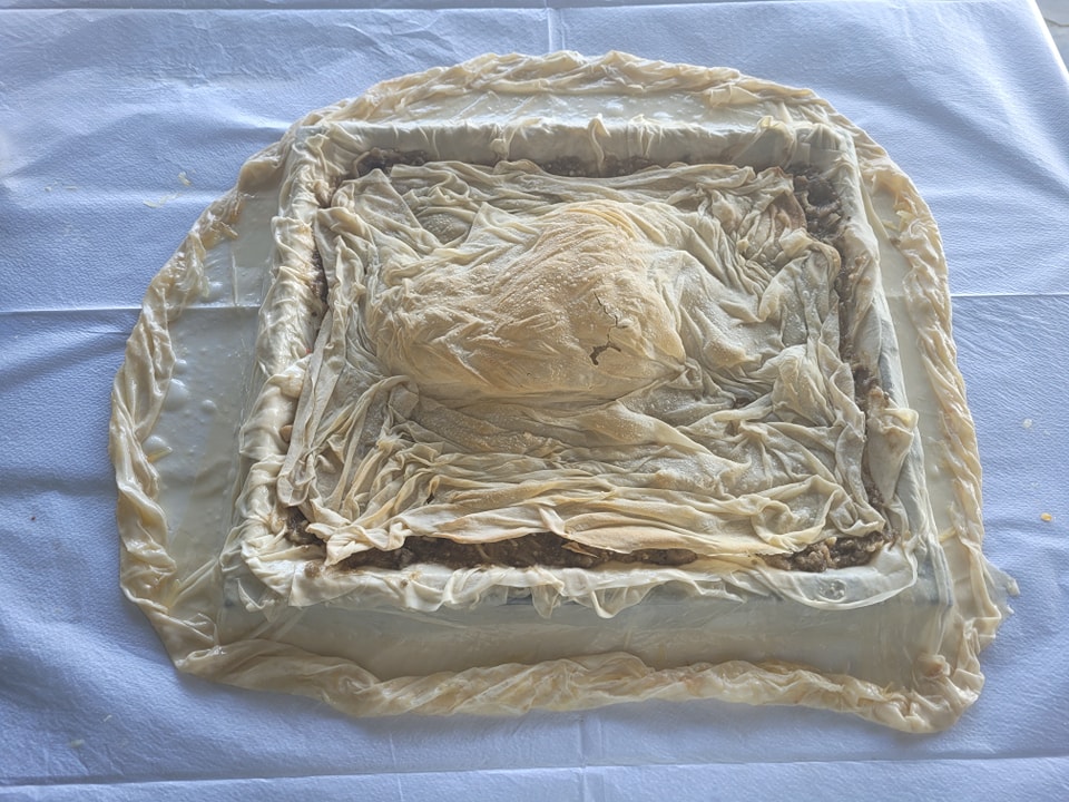 2) Άνοιξα 1 φύλλο και το έβαλα πάνω και έξω από το ταψί!
