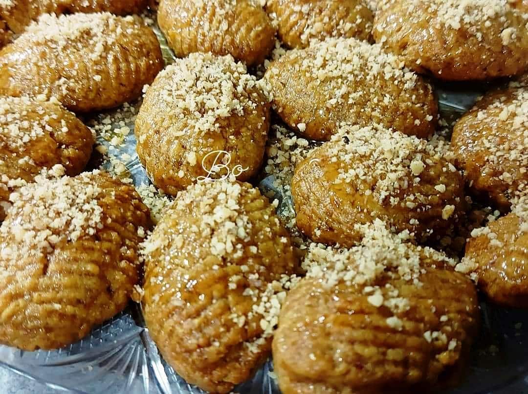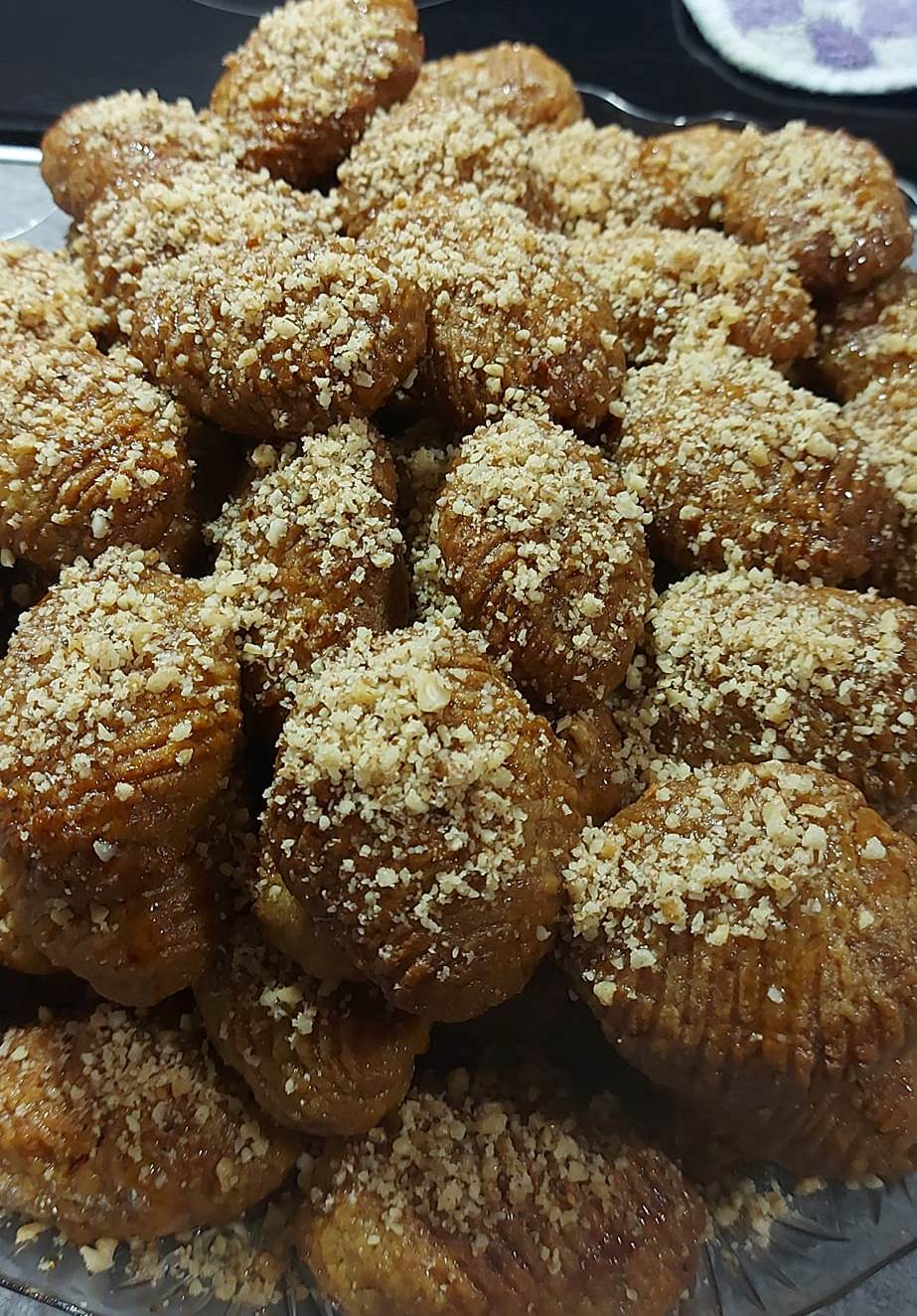 Σε προθερμασμένο φούρνο στους 160-170 ψήνω μέχρι να ροδίσουν. Τα βουτάω απευθείας στο σιρόπι.. Από πάνω βάζω μέλι και καρύδια.