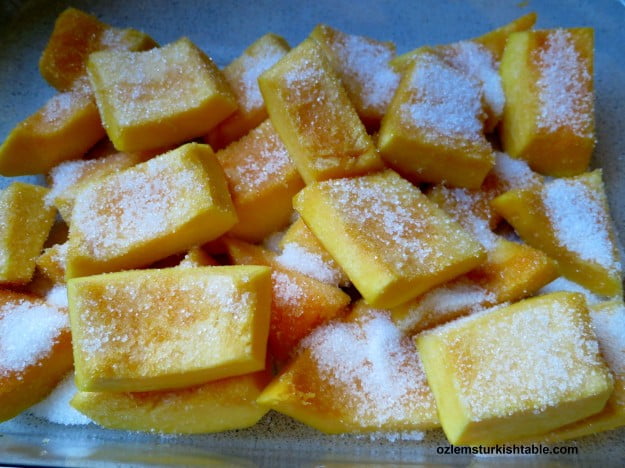 Την επόμενη μέρα, θα παρατηρήσετε ότι η κολοκύθα έχει απελευθερώσει όλους τους χυμούς της και ότι τα κομμάτια είναι σχεδόν καλυμμένα με όλο αυτό το θαυμάσιο χυμό.