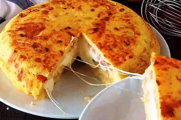 Τοποθετούμε τη γέμιση (λεπτές φέτες ζαμπόν και τυρί) πάνω στην τορτίγια, τη σκεπάζουμε με τη δεύτερη τορτίγια πατάτας από πάνω.