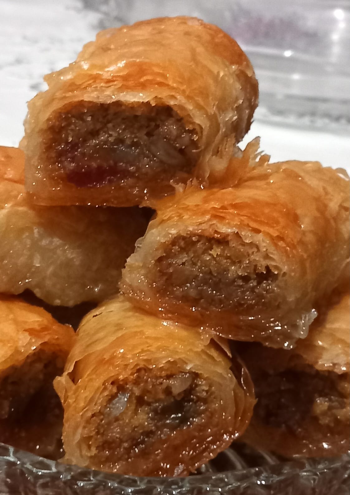 Στρώνουμε 3 φυλλα βουτυρωμενα …βαζουμε γεμιση..τυλιγουμε ρολό..