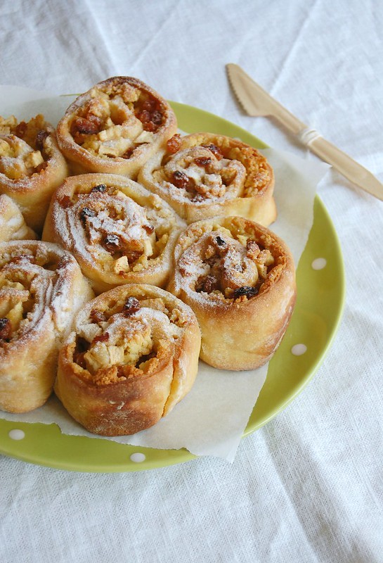 Χτυπήστε τη ζύμη με τη γροθιά σας για να ξεφουσκώσει και στη συνέχεια βάλτε την σε μια αλευρωμένη επιφάνεια. Ανοίξτε τη ζύμη σε ορθογώνιο 40x20cm . Σκορπίστε την τριμμένη αμυγδαλόπαστα πάνω από τη ζύμη σε απόσταση 1cm από τις άκρες. Ξεφλουδίστε και ψιλοκόψτε το μήλο και διασκορπίστε πάνω από την αμυγδαλόπαστα. Ανακατεύουμε τις σταφίδες με την κανέλα και τα πασπαλίζουμε πάνω στα μήλα. Ξεκινώντας από ένα μακρύ άκρο, κυλήστε τη ζύμη σε ένα μακρύ, λεπτό ρολό σχήμα λουκάνικου.