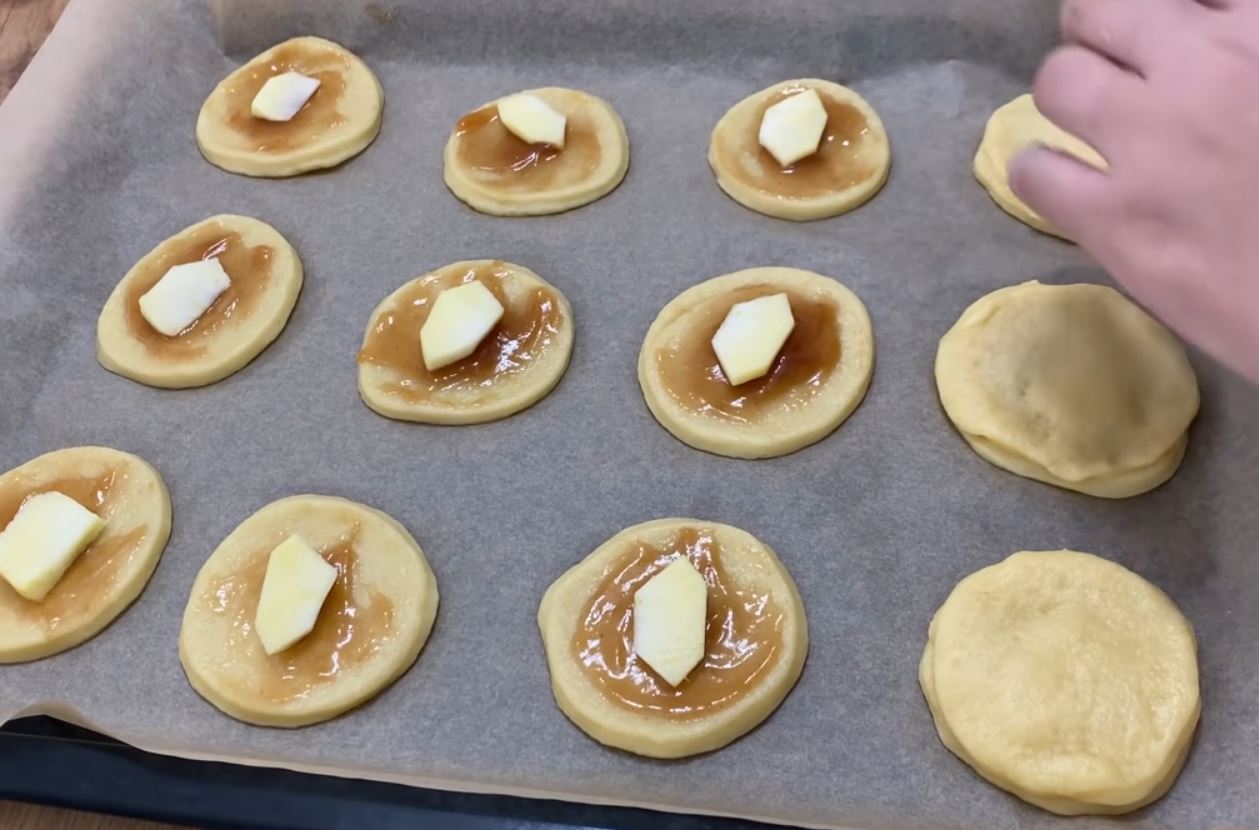 Απλώνουμε τη μαρμελάδα μήλο επάνω σε κάθε πιτάκι από αυτά που έχουμε στο ταψί και από πάνω βάζουμε ένα μικρό κομμάτι μήλο