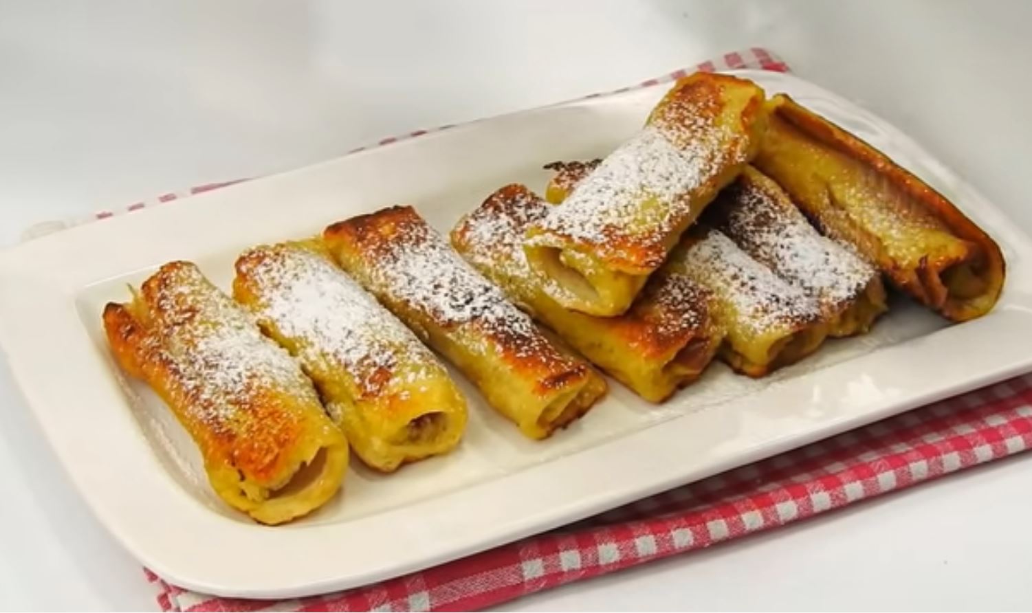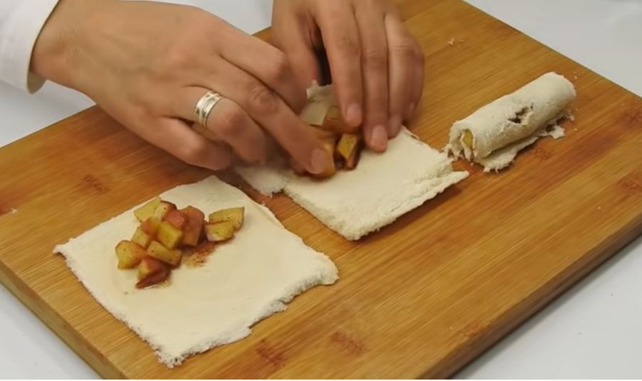 Βάζουμε σε κάθε φέτα μια κουταλιά από τα καραμελωμένα μήλα και τυλίγουμε σε ρολάκια.