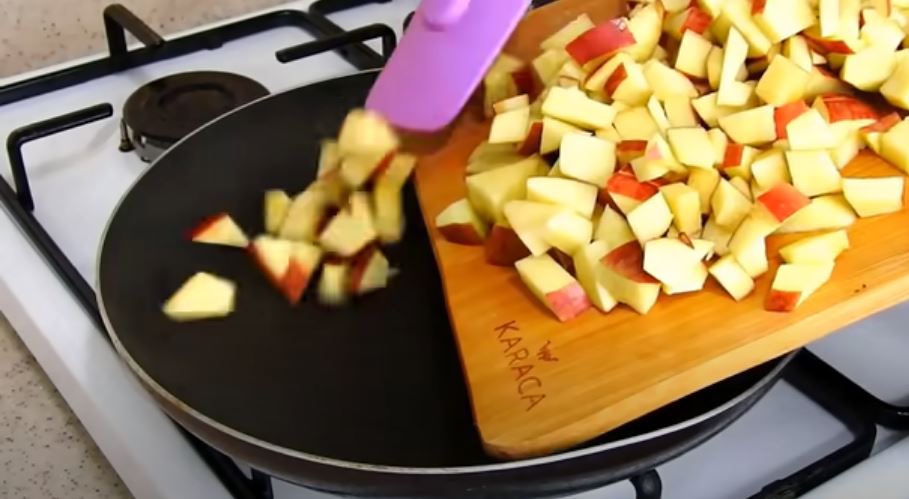 Ρίχνουμε τα μήλα σε ένα τηγάνι σε μέτρια φωτιά.